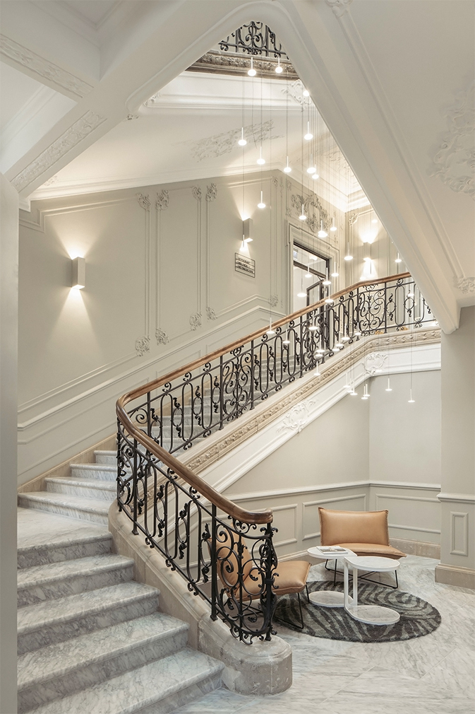 Nobis Hotel Copenhagen’s original windows, mouldings and wood and marble staircase have been preserved. These turn-of-the-century details are paired with modern additions, including a new concrete check-in desk in the reception that references the 5,500 sq m building’s fabric.