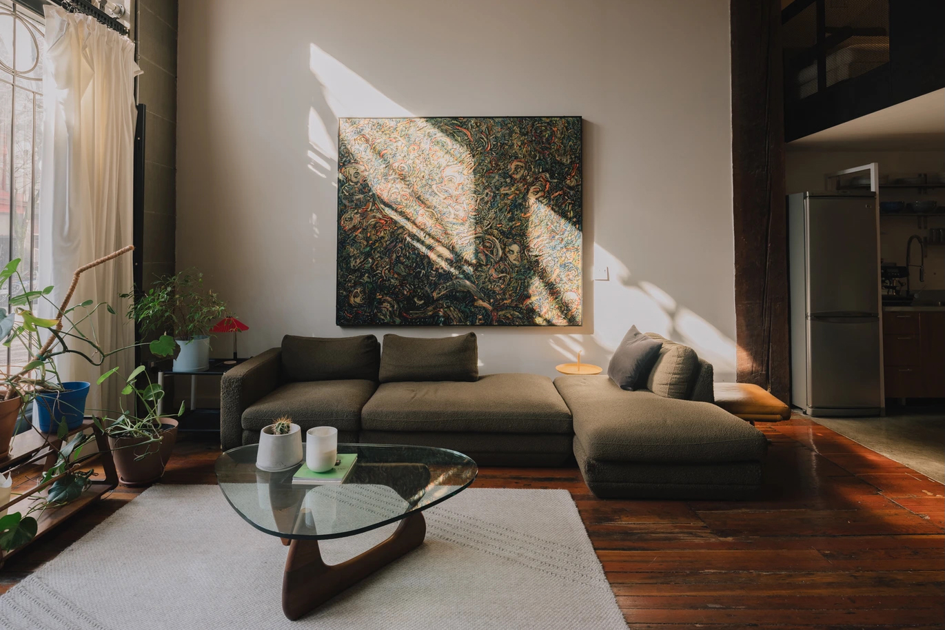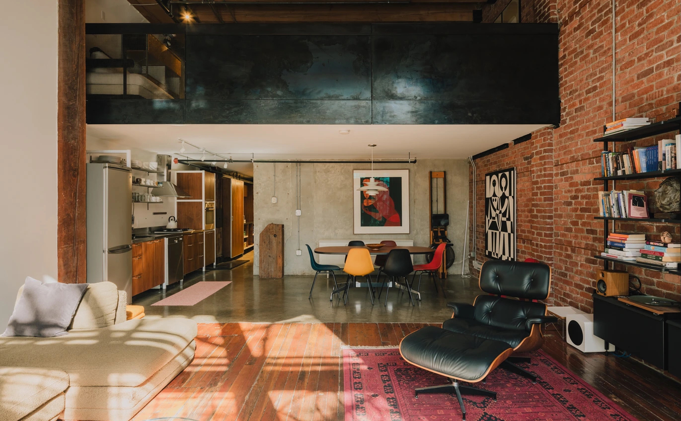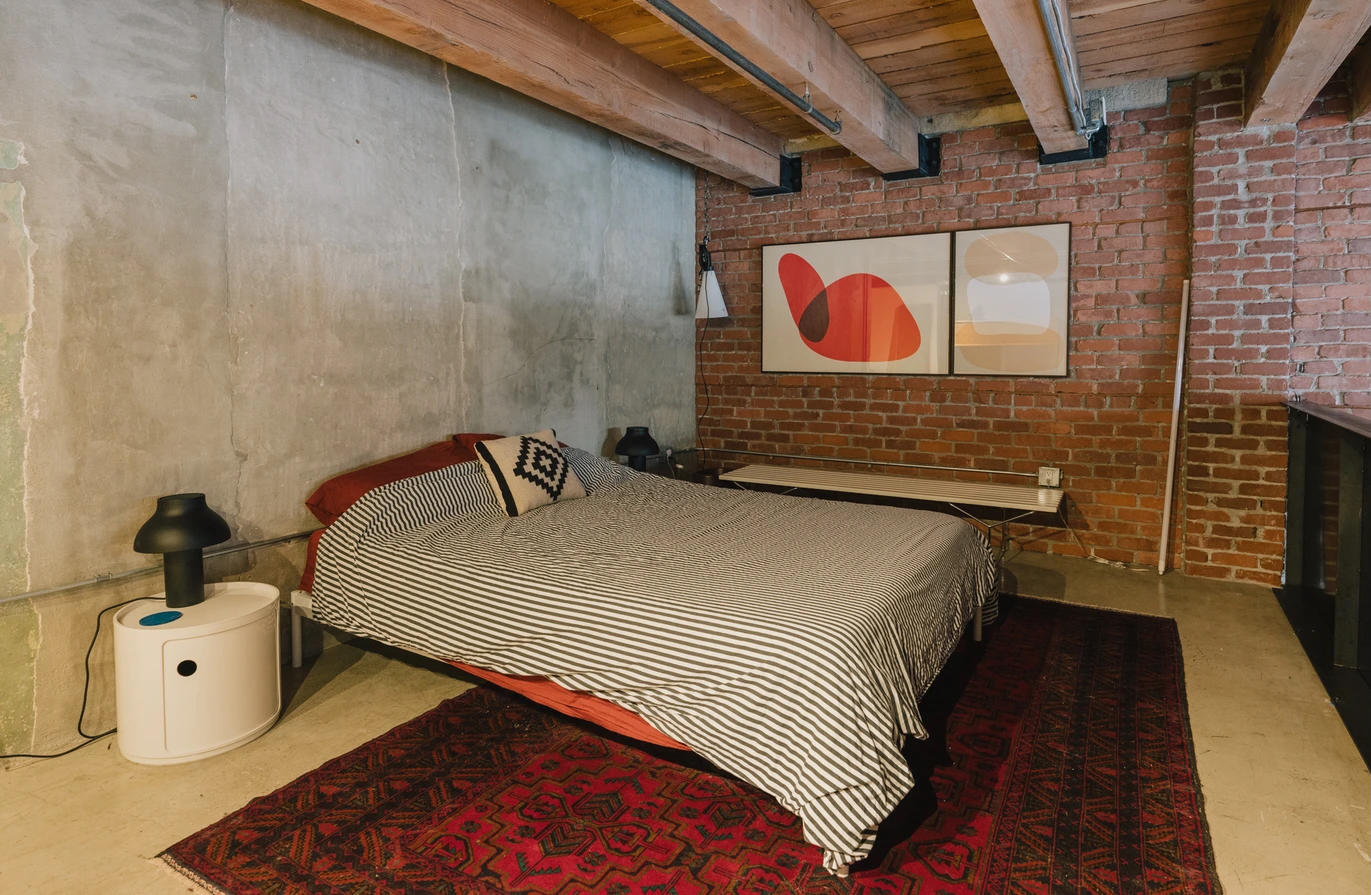 Set within the Koret Lofts building, this live-work apartment sits at ground level within a former warehouse in Vancouver’s Gastown district. The space extends 1,753 square feet over two levels, with double-height, south-facing storefront windows opening directly to East Cordova Street. The original structure remains visible throughout. Exposed brick walls, concrete surfaces and heavy timber elements form the primary material palette. The lower level centres on a double-height living area, while the upper level introduces separation for sleeping and more private use.