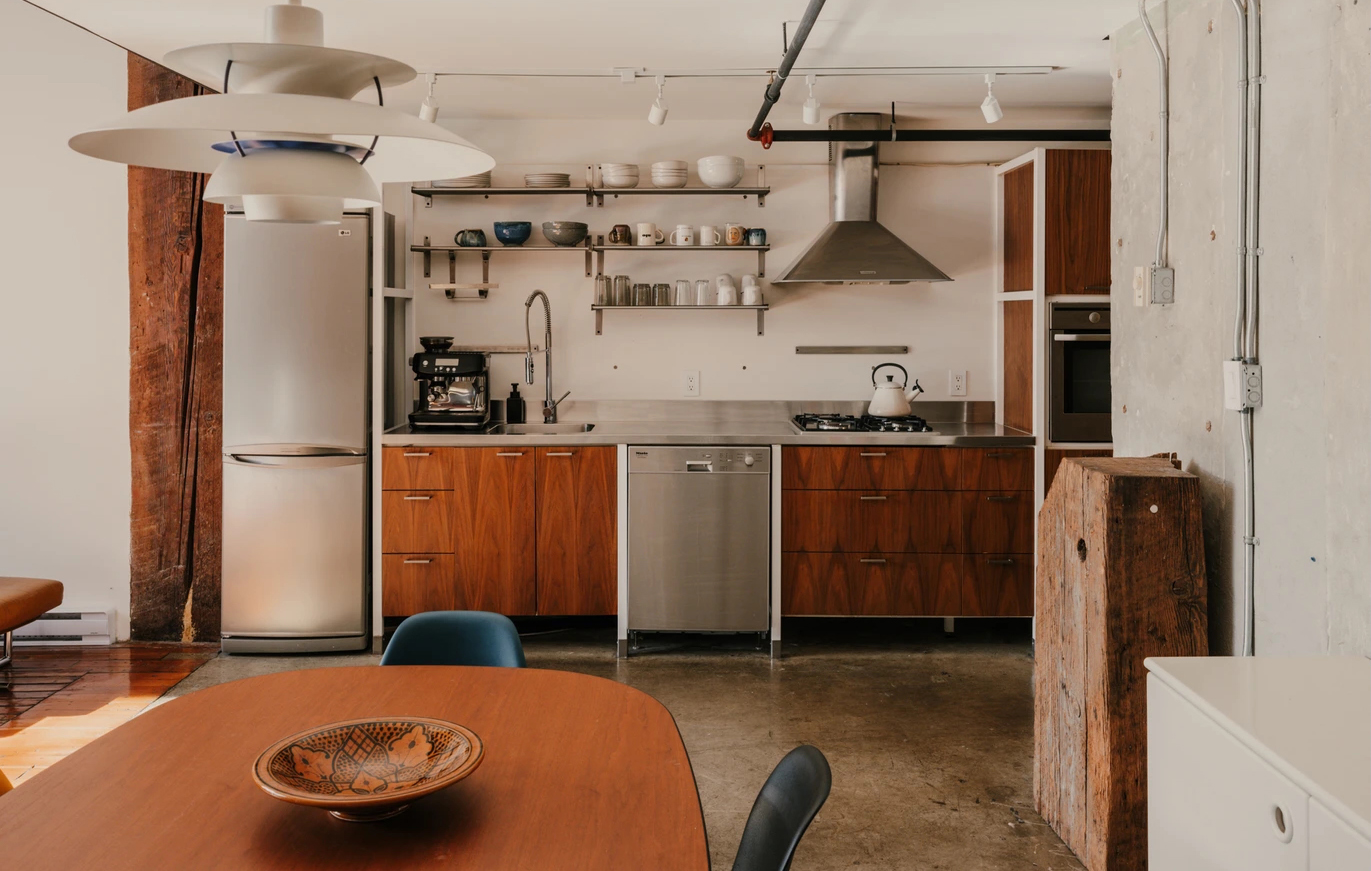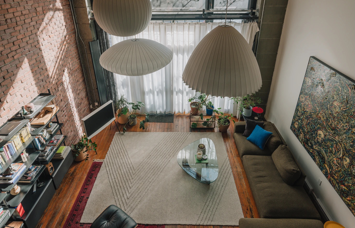 A kitchen and millwork by Alda Pereira are positioned on the main floor alongside a Duravit bathroom. Custom architectural metalwork introduces division and privacy while maintaining sightlines across the space. Lighting is arranged through suspended fixtures scaled to the height of the room, including pieces by Herman Miller, Louis Poulsen and Danese Milano.