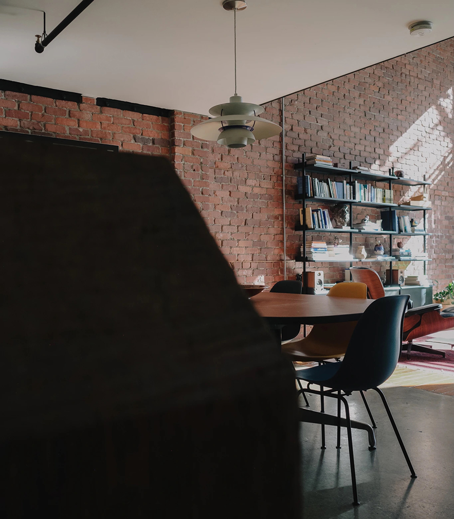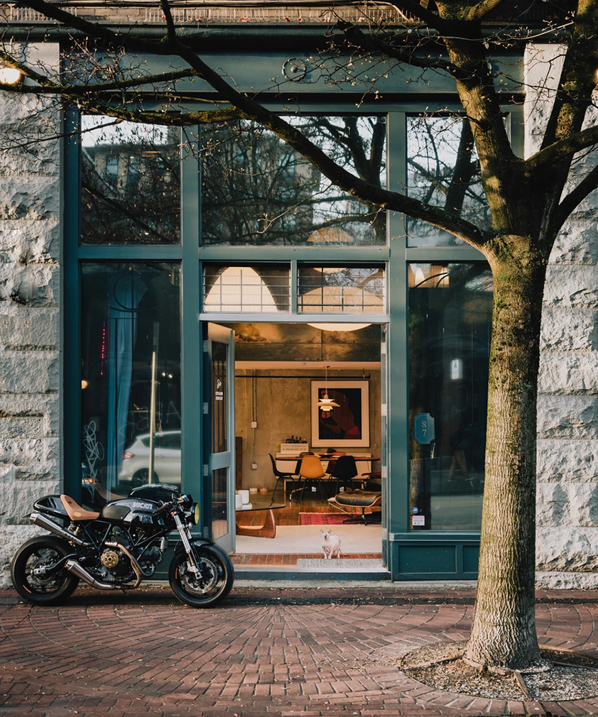 Set within the Koret Lofts building, this live-work apartment sits at ground level within a former warehouse in Vancouver’s Gastown district. The space extends 1,753 square feet over two levels, with double-height, south-facing storefront windows opening directly to East Cordova Street. The original structure remains visible throughout. Exposed brick walls, concrete surfaces and heavy timber elements form the primary material palette. The lower level centres on a double-height living area, while the upper level introduces separation for sleeping and more private use.
