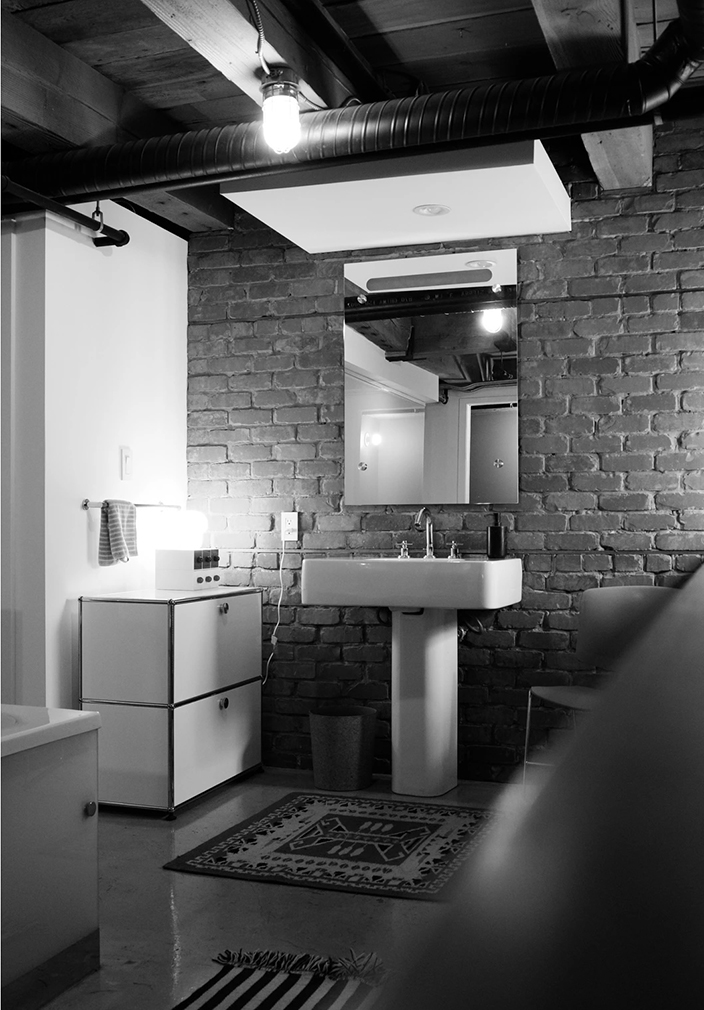A kitchen and millwork by Alda Pereira are positioned on the main floor alongside a Duravit bathroom. Custom architectural metalwork introduces division and privacy while maintaining sightlines across the space. Lighting is arranged through suspended fixtures scaled to the height of the room, including pieces by Herman Miller, Louis Poulsen and Danese Milano.