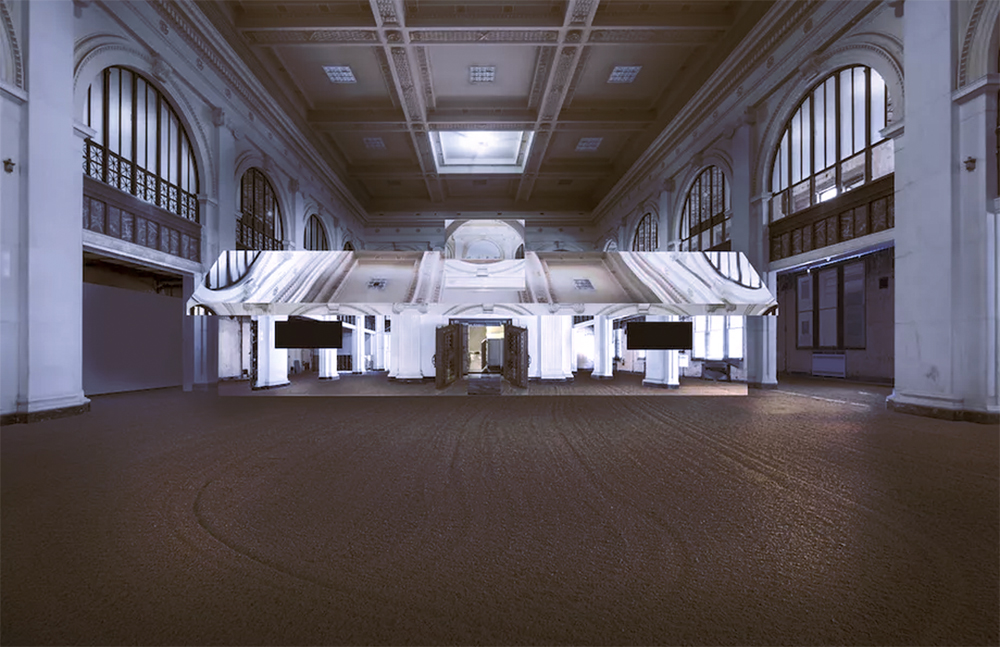 Natural light will be blocked from the building for the duration of the installation, which opens on 10 October, to create a surreal artificial world, with lighting design by Andi Watson. The bank’s marble floor will also be covered in river rock and earth.