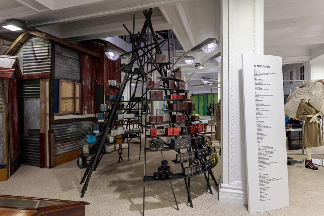 Her installations include the ground floor’s Dover Street Market hut, made from wood and corrugated iron and the first-floor lighting, comprising clusters of long LEDs dropping from the ceiling in a work called ‘Frozen Waterfall’.
