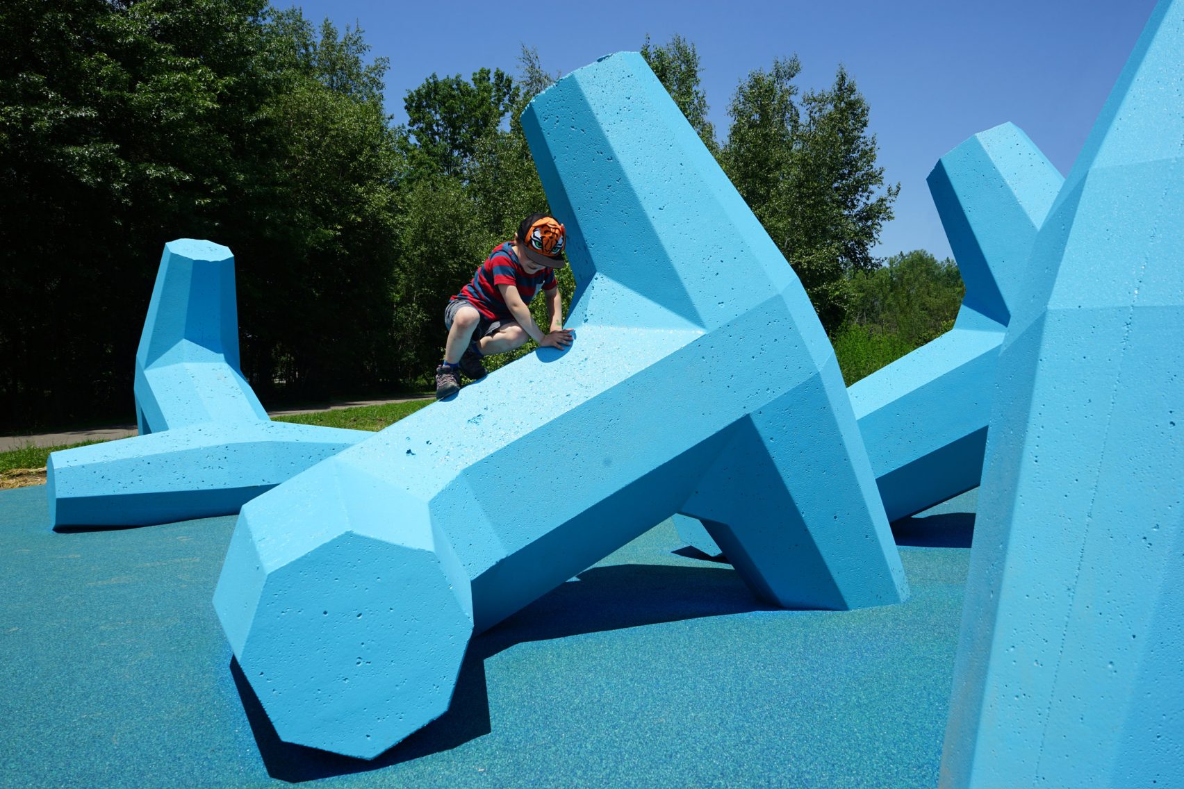 Canadian artists Julia Jamrozik and Coryn Kempster are known for ‘social infrastructures’ that foster playful public interactions. Several years ago they inaugurated Breakwater in a New York State park, using brightly painted pre-cast concrete masses called ‘dolosse’, like those typically used around piers and sea walls. Placed in an interlocking formation on a soft rubber base, the seven-tonne blocks make a comfortably low climbing frame — and a pleasing open-air sculpture referencing maritime imagery. The blue polyurea coating provides a tactile surface for sliding, lounging and climbing.