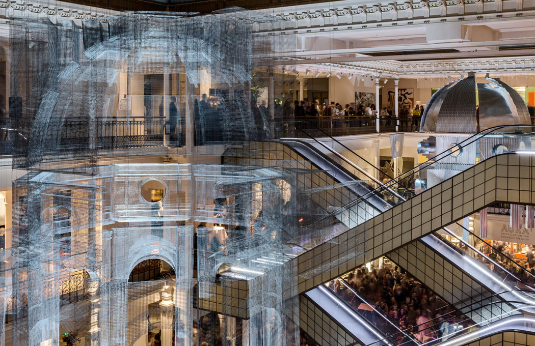 The Italian artist – who creates spectral architecture in unexpected spaces – has hung two Neoclassical domes from the department store’s Gustave Eiffel-designed glass ceilings for his latest site-specific work, titled Aura.