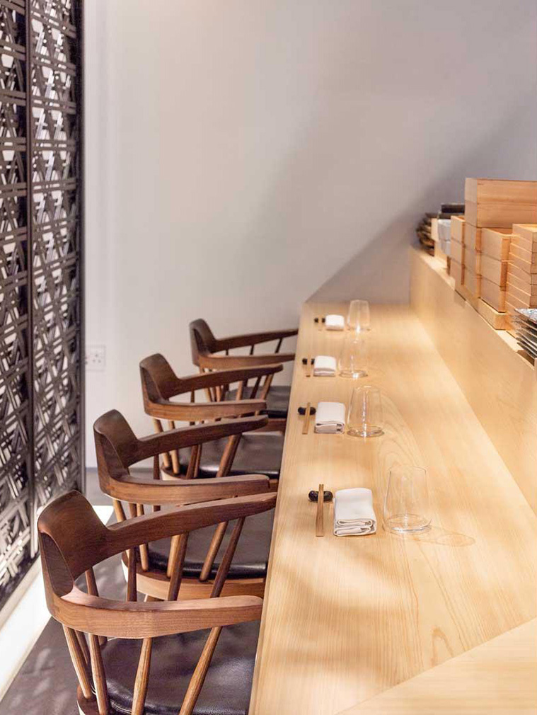 This intimate izakaya sits on the first floor of Japan House, the Japanese cultural centre in London’s Kensington neighbourhood. Chairs in the dining room, bar area and open-kitchen counter are Nakashima designs, made by the Sakura Seisakusho studio in Shikoku Japan with the designer’s favourite black walnut and topped with black leather cushions.