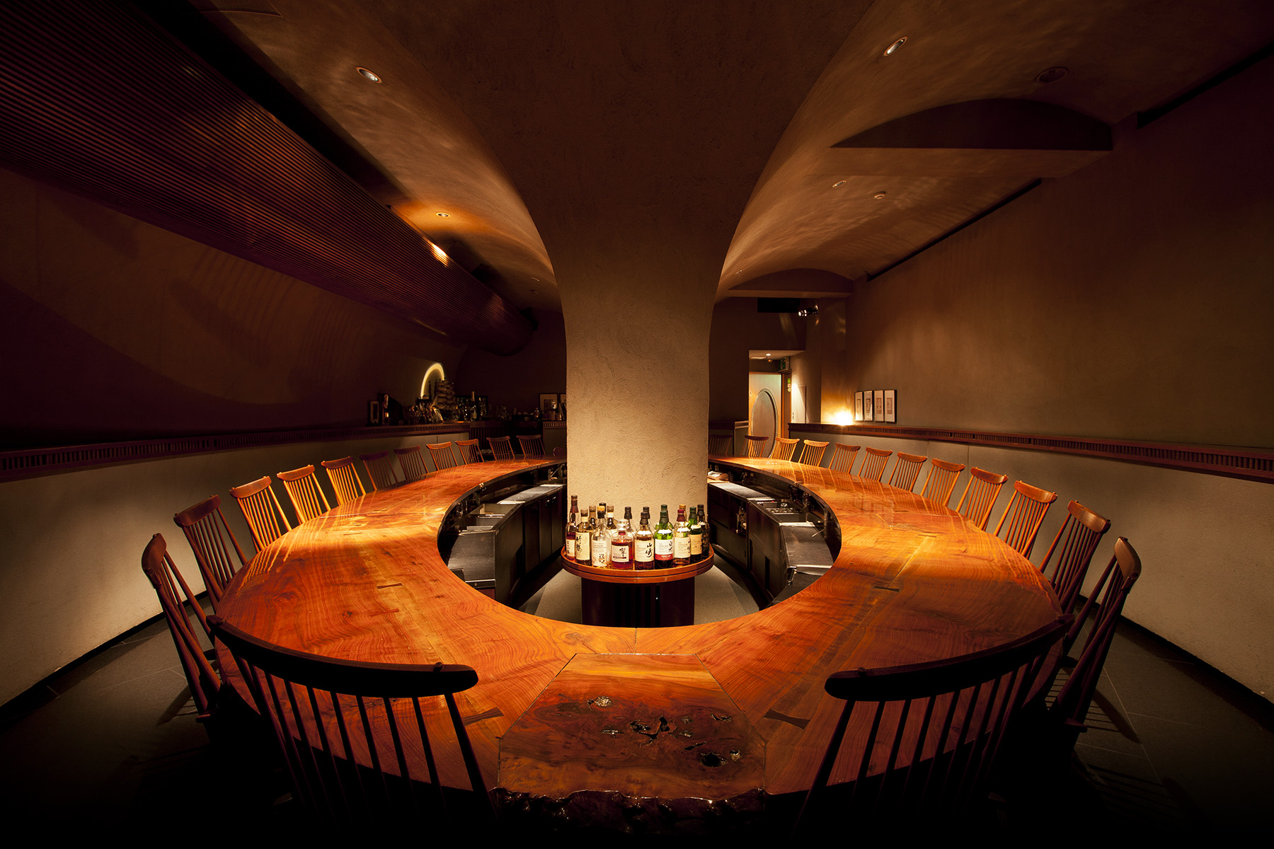 The family still had fans in Tokyo when, in 1993, this subterranean Ginza café was made over as a bar for serious whiskey buffs, with an intimate one-room interior by architect Takahiko Yanagisawa. The single horseshoe-shaped table, constructed by Sakura Seisakusho with Nakashima’s values to mind, is paired with more than a dozen Nakashima loungers with spindle backs and upholstered seats.