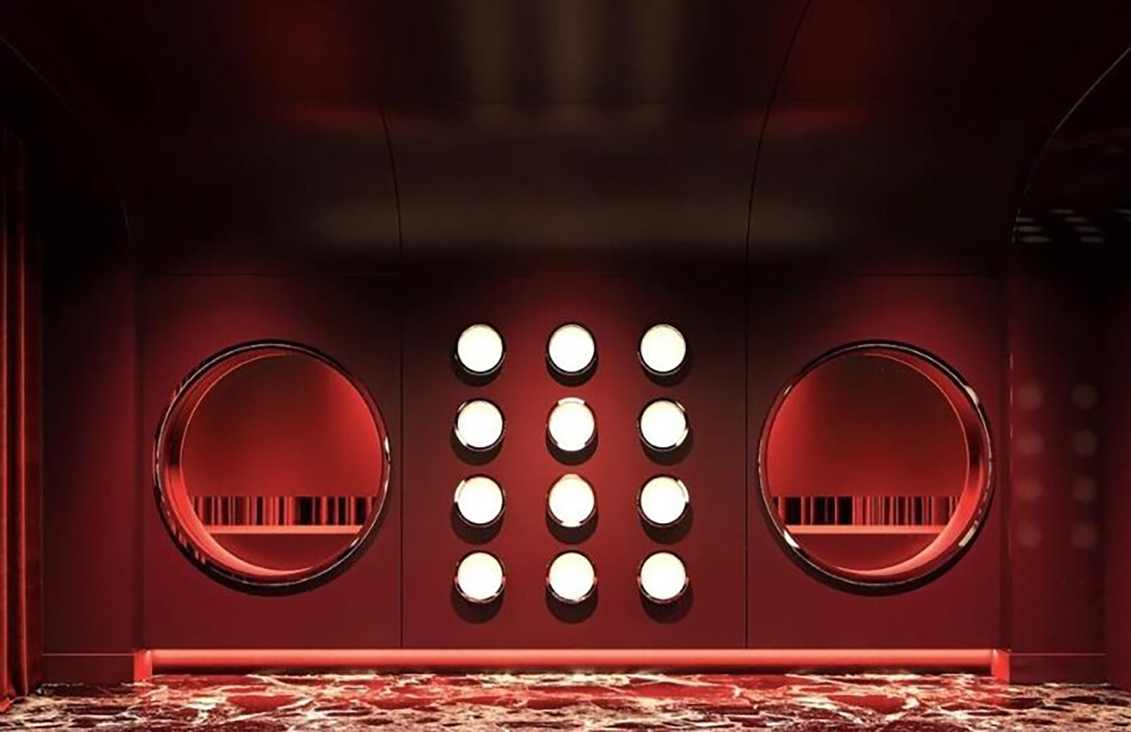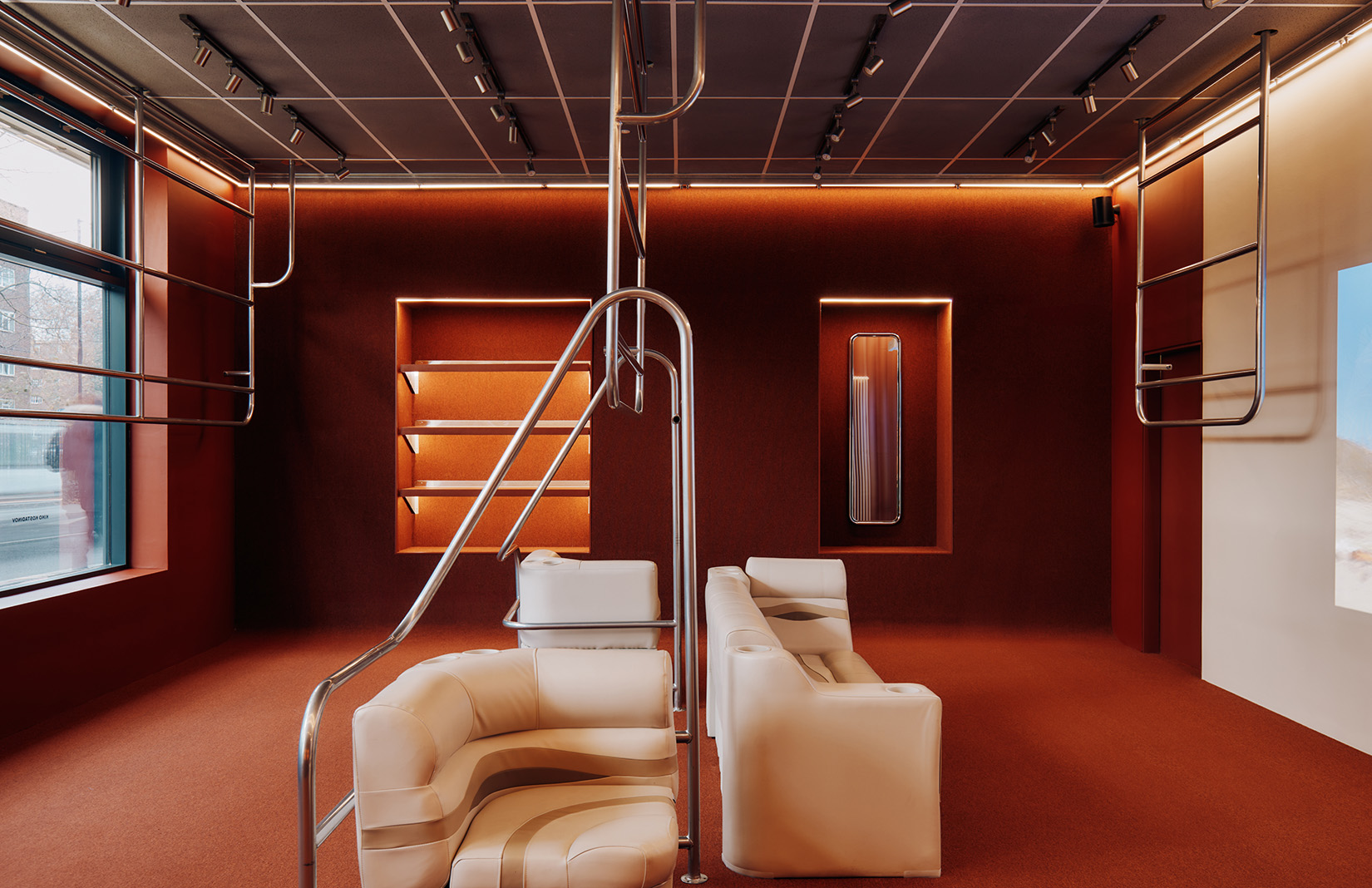 Menswear designer Kiko Kostadinov enlisted THISS Studio to design his first flagship boutique, in east London. Doubling as an exhibition space for artist and collaborator Ryan Trecartin, the shop features chrome pontoon railings, flipped upside down and mounted to the ceiling to function as clothing rails. The deep maroon of the carpet is extended up the walls and into a colour-drenched tunnel lined with a deep red curtain.