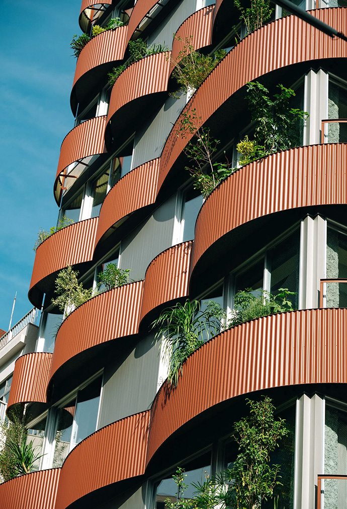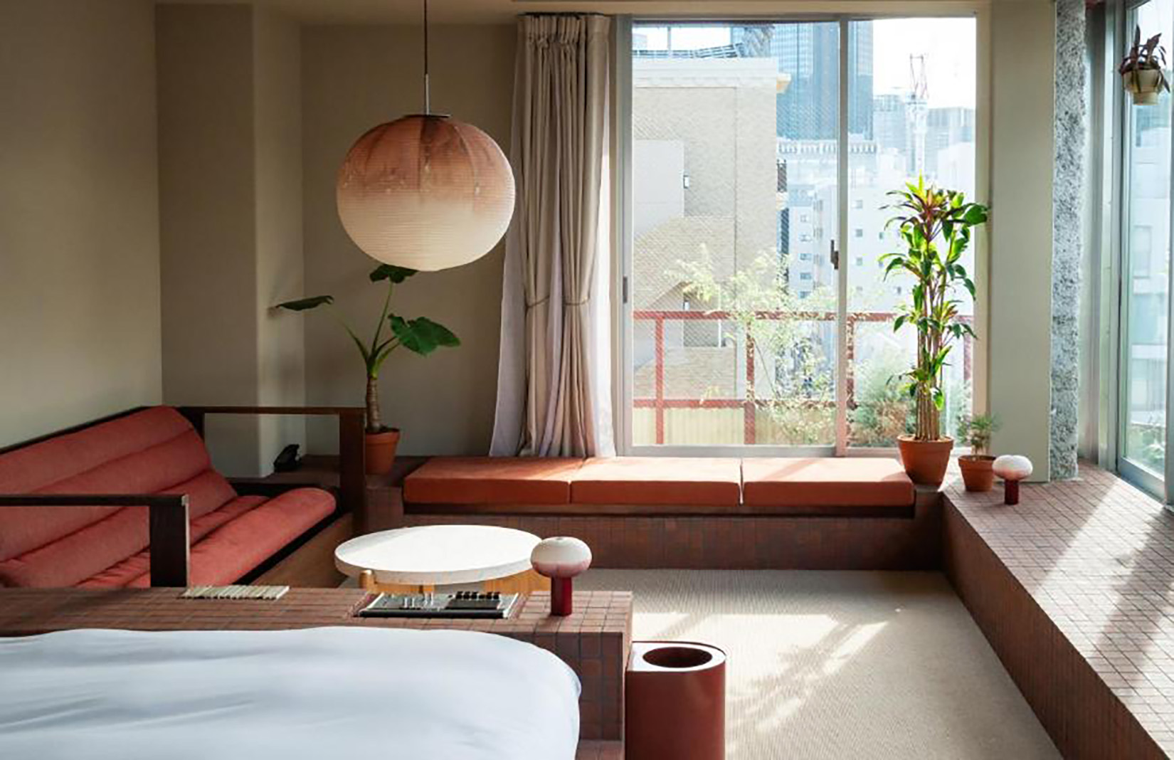 Outfitted in a suite of terracotta colours, this 14-room hotel sits around the corner from Tokyo’s central station. The rusty elements play into the vintage feel of the interior and coordinate with the rippled window boxes outside, conceived by architect Kiyoaki Takeda. Terracotta brickwork appears outdoors and in.