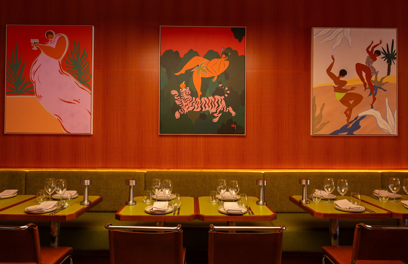 Both the sun-kissed and mood-lit dining rooms at Caffè Zaffri riff on the Lebanese-flavoured menu, with tones of cinnamon, blood orange, tomato and spice. Post Company is responsible for the tactile upholstered booths, silk trim, custom wall coverings and identity on the rare-red menus.