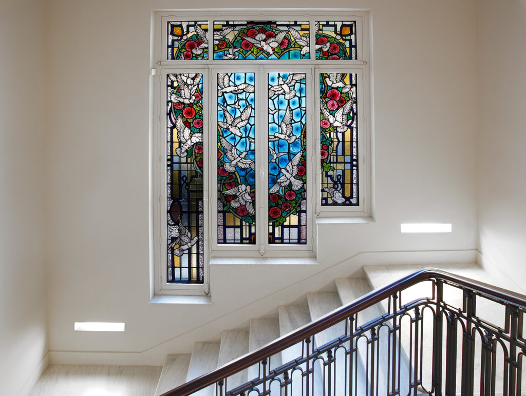 The building’s stark white walls and period features are contrasted by geometric sculptures and installations – including one that is reminiscent of a swimming pool with lifeguard chair – as well as large two-dimensional paintings.