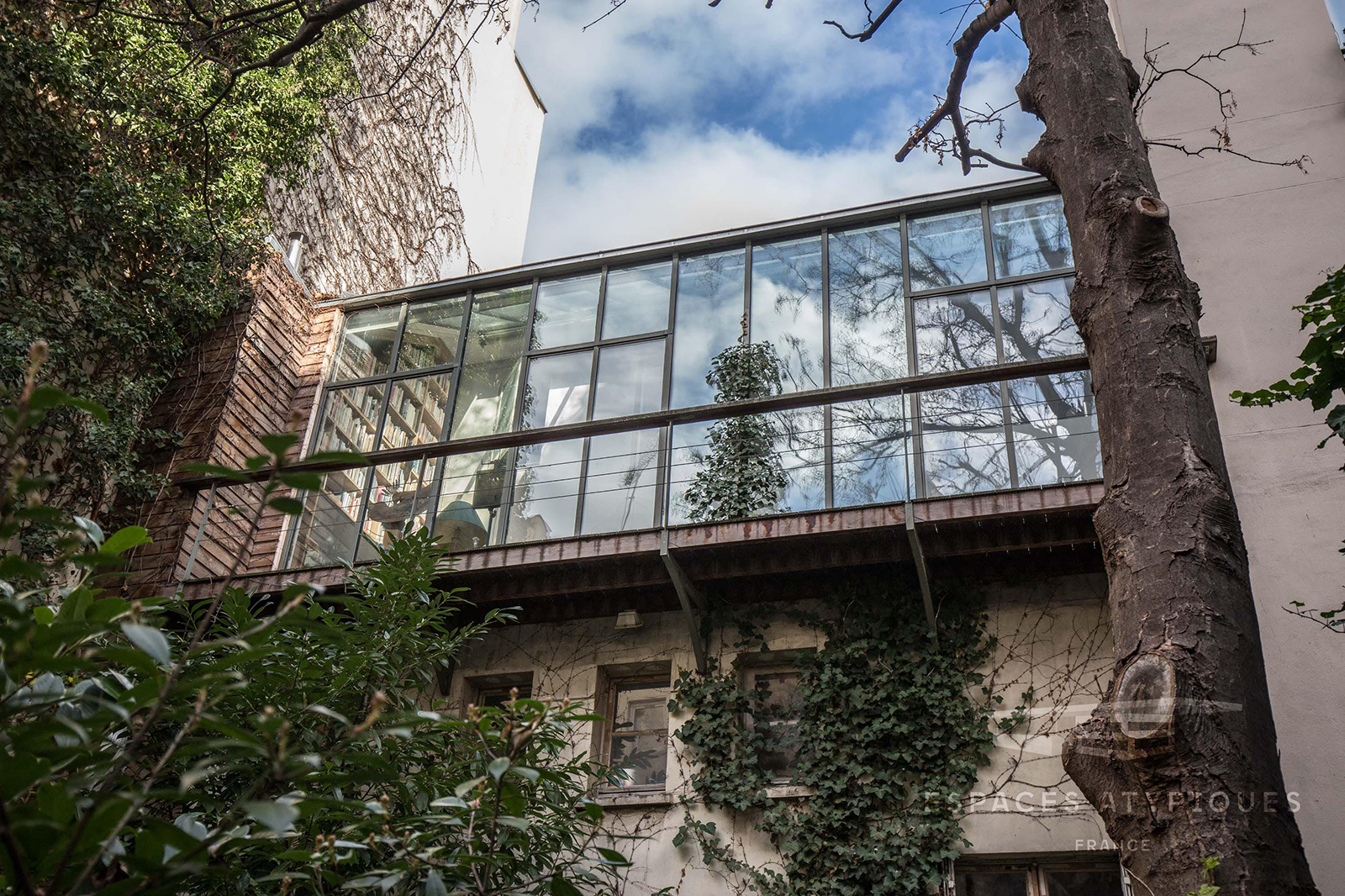 Beside Canal Saint-Martin in a private courtyard community, this loft-style home has quiet open-plan spaces with extensive glazing. Its interior is cottage-like, cosy and warm and features timber pillars, varnished floorboards, an exposed stone wall and a pitched full-length skylight, which pours sunlight into the kitchen.