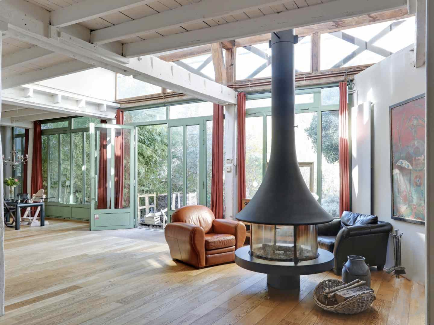 The painter who converted this 2,540 sq ft shed into a loft has honoured its industrial past. Retaining its original voluminous proportions, it has a glazed wall with metal framing, a galleried double-height main room and a pitched roof. The layout of the Paris property, located in the city’s southern suburbs, is free-flowing thanks to an open steel staircase, and it has potential for a variety of uses, from a live/work space to a pied-a-terre.