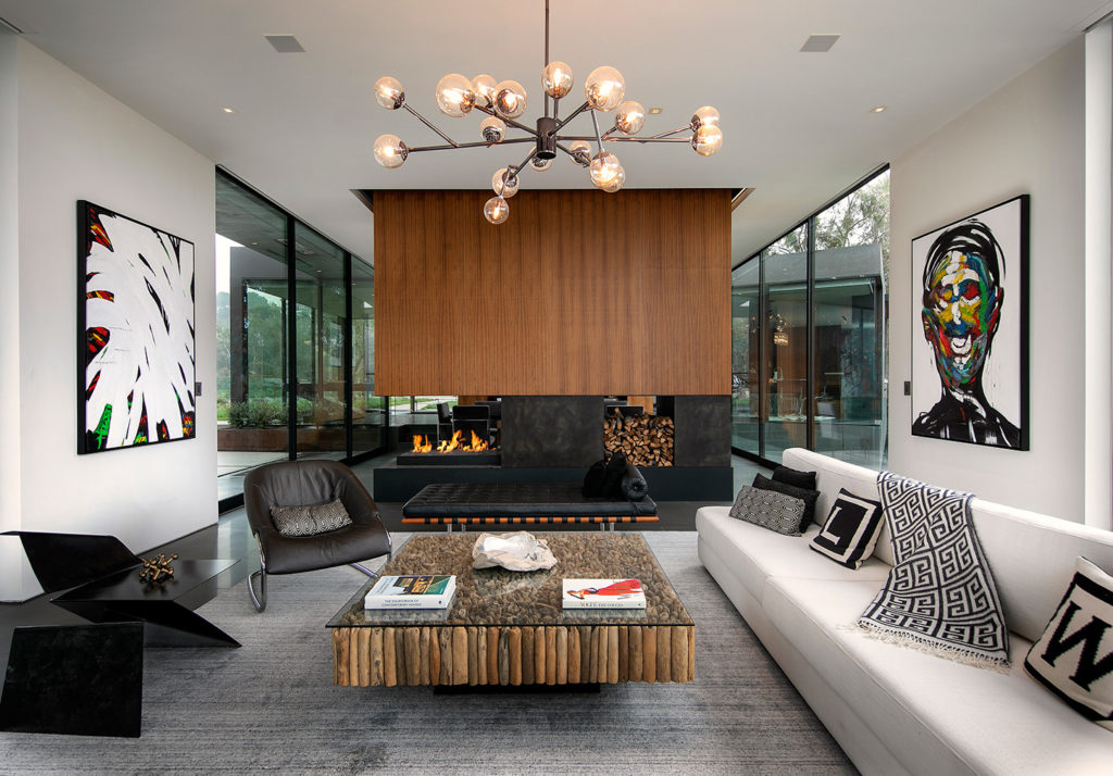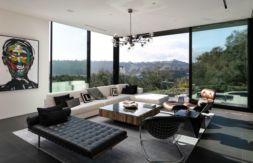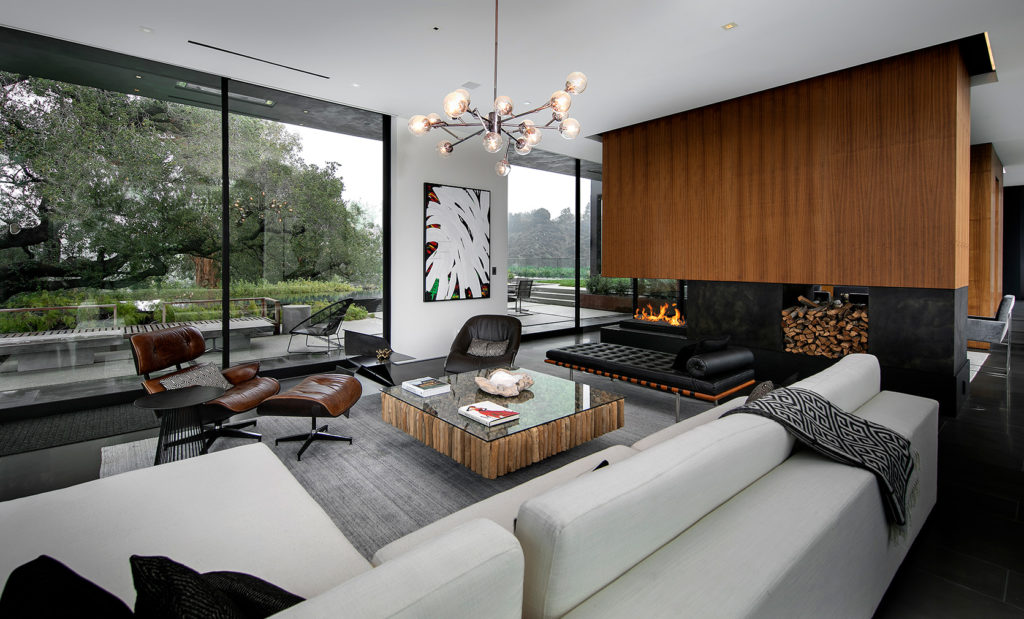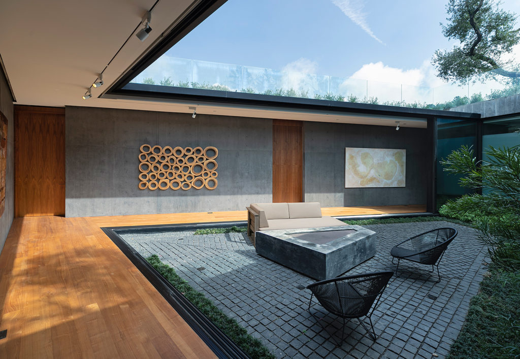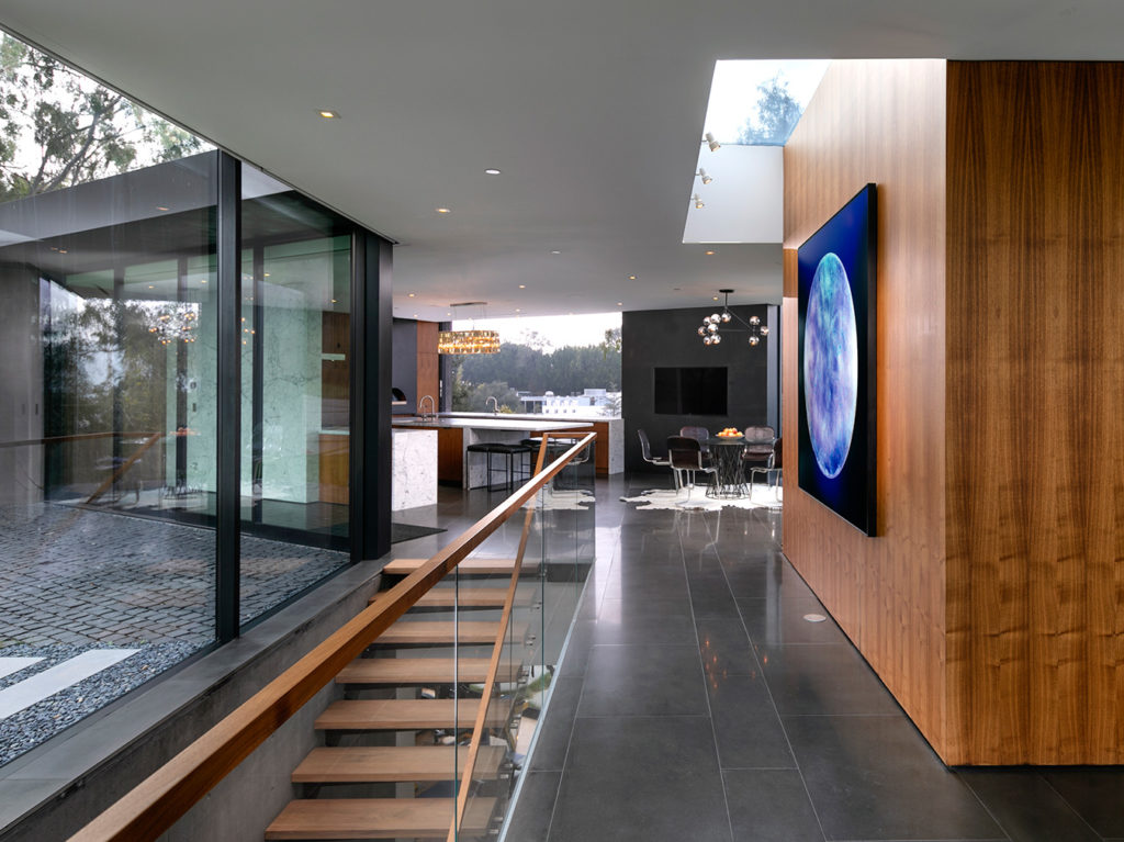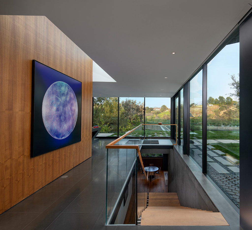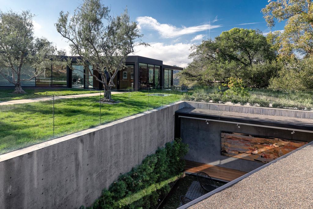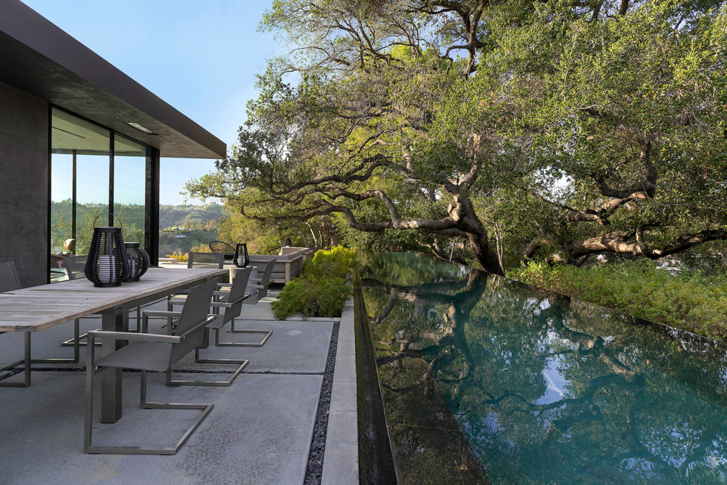A subterranean courtyard draws light into the lower floors, while a 75-ft-long infinity pool bisects the house and flows beneath one of the most massive oak trees on its 3.48-acre plot.