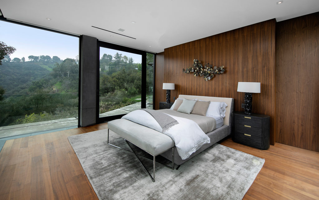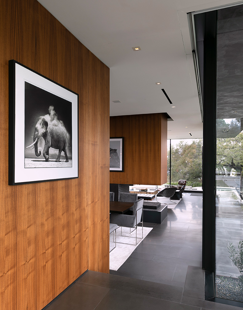 Textured concrete and walnut panelling hone the modernist vibe inside the Los Angeles property – on the market via Compass with price on enquiry.