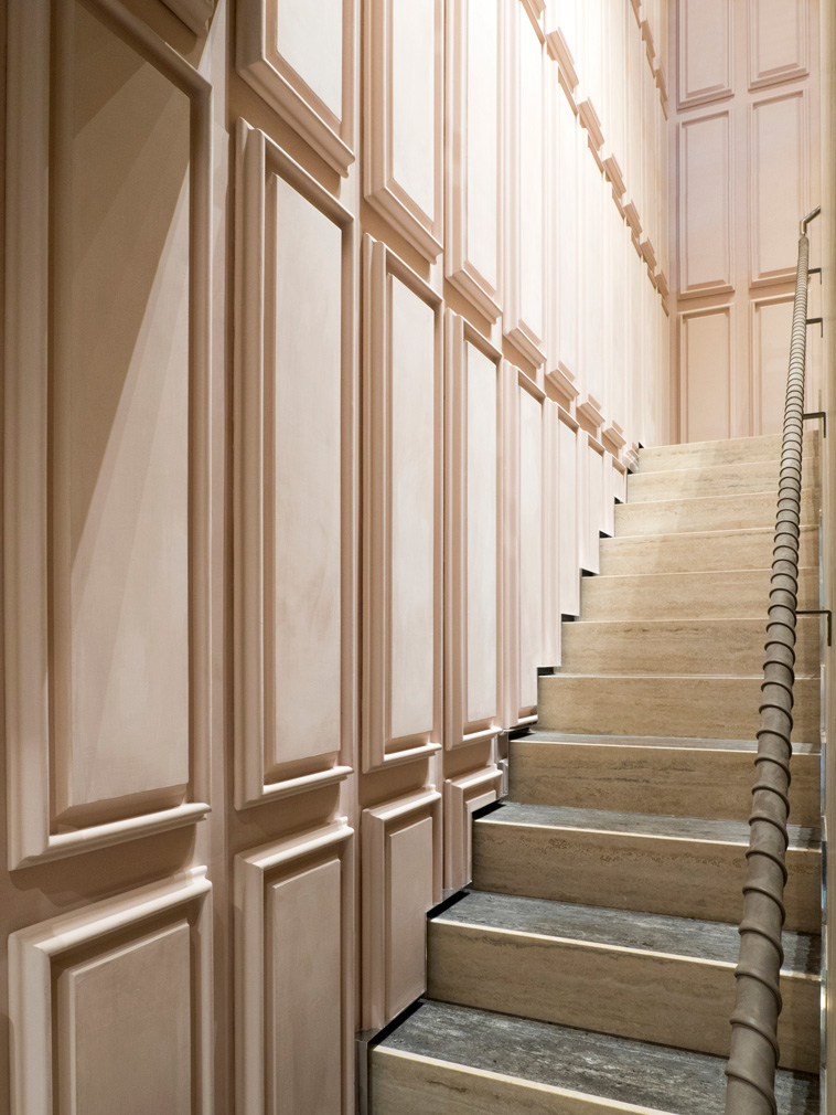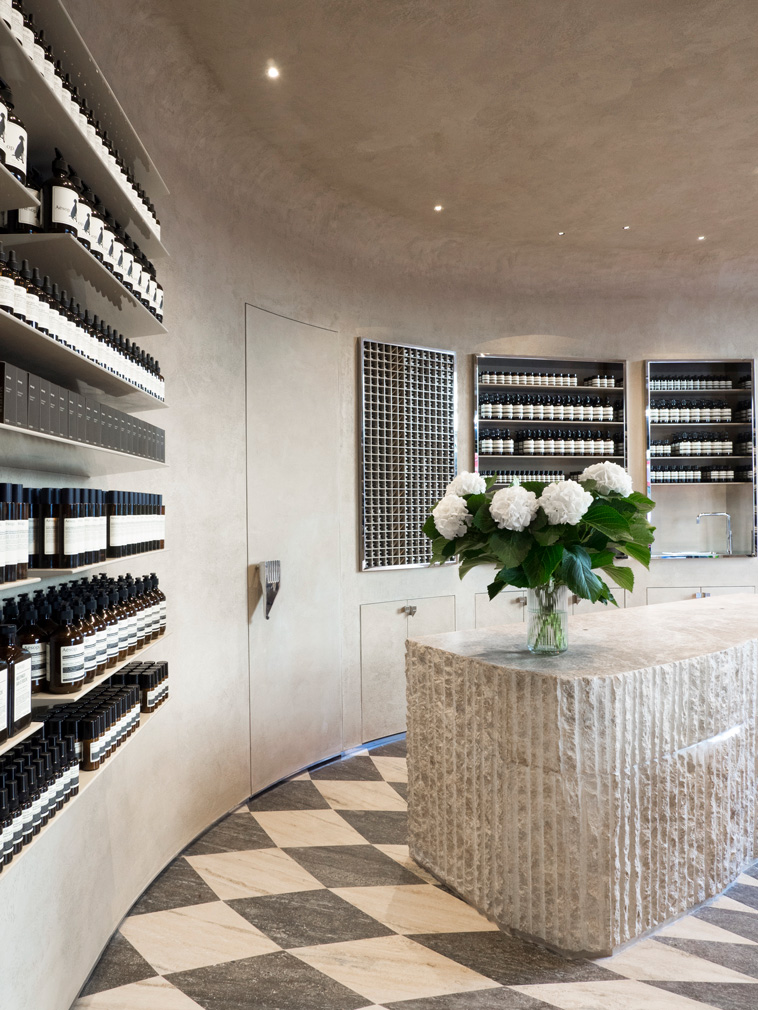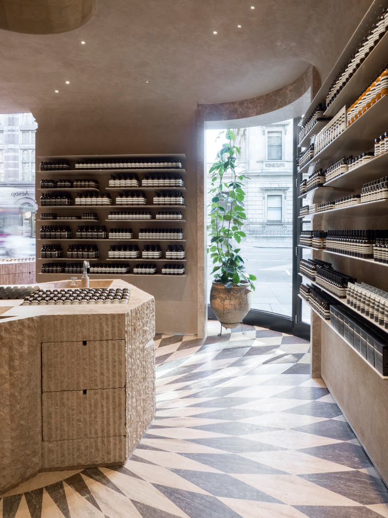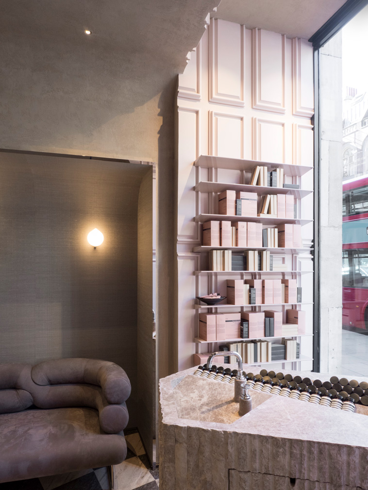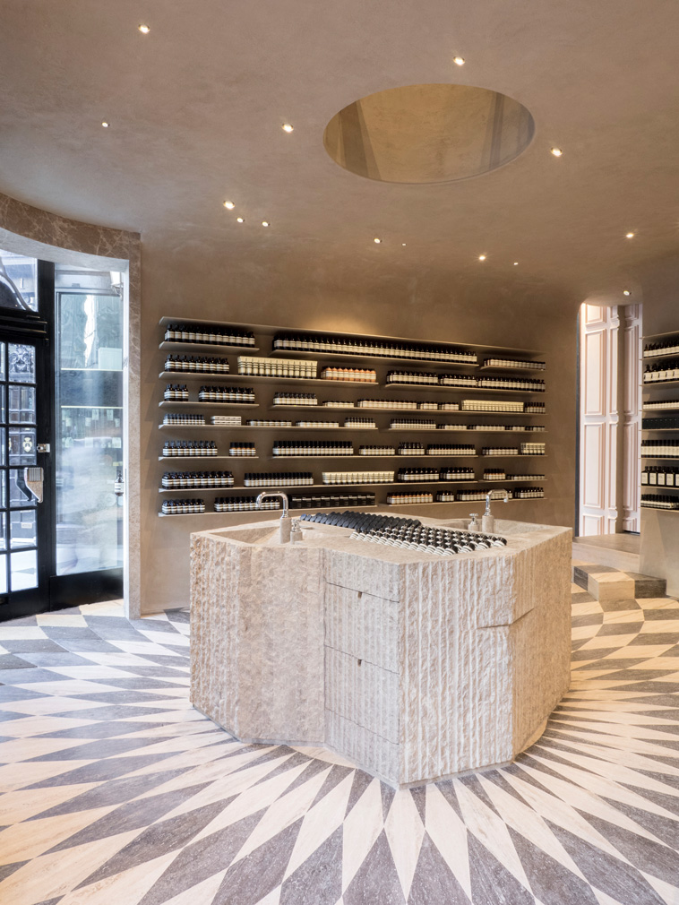 It’s the second time the director has teamed up with the brand, and his interiors for the London store are enjoyably stark, with a diamond-patterned stone floor that radiates out from a central counter, made from rough-carved marble.