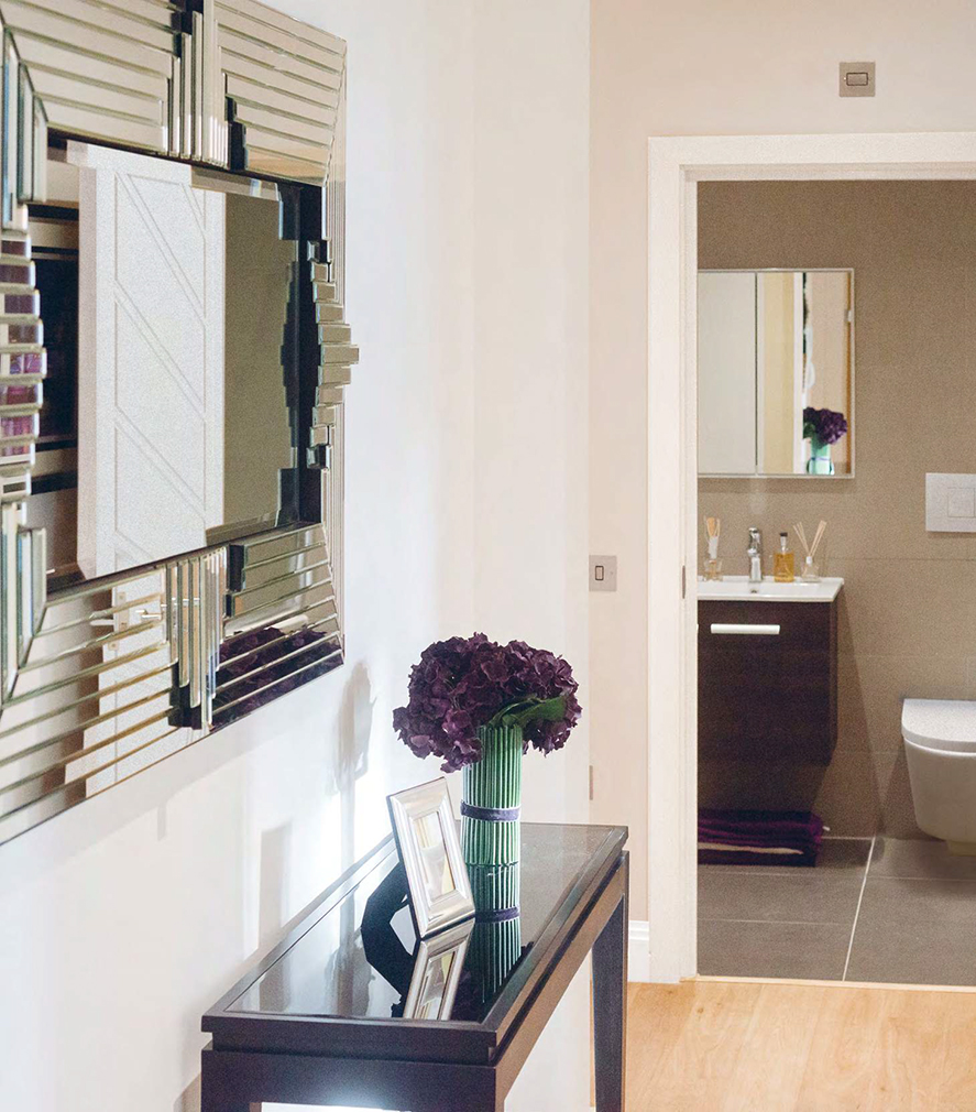 Bedrooms are fitted with frosted glass sliding wardrobes, with a grid design that evokes opaque Crittall windows. According to the brochure, ‘original Art Deco features [have been] retained internally wherever possible.’