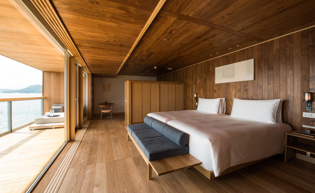 Timber floors, walls and ceilings are used across its 19 cabins, which range from 50 to 90 sqm and each are designed to capture views of the water. Contemporary Japanese screens provide additional privacy while folding glass doors can open rooms up to the outside terrace.