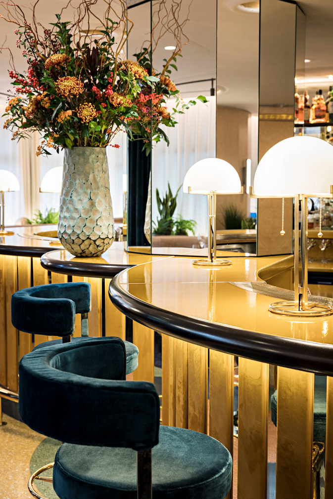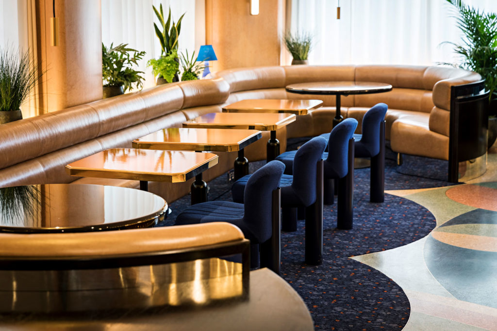 Mirrored tables edged by gold, and a gilded bar complete the look, with bespoke lighting hanging from sunken circular light wells, and a geometric and colourful terrazzo floor.