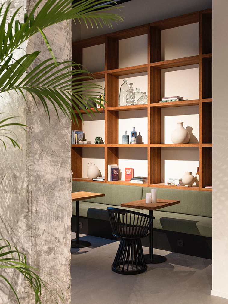 Black, slatted ceilings continue the colour theme, while furniture across the Brussels coworking space has a modernist bent, with sofas and booths upholstered in calming, soft green shades.
