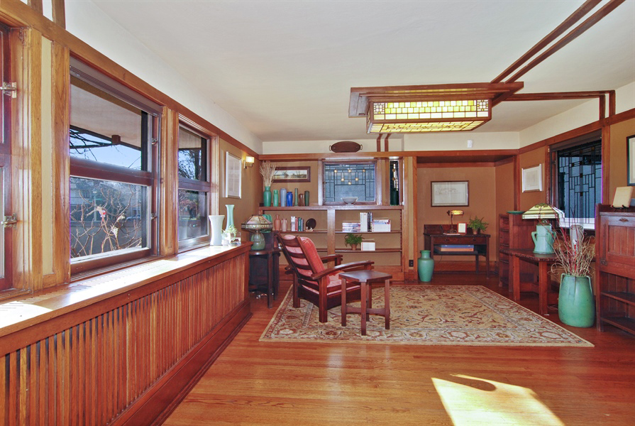Firmly planted in the Prairie horizontal, the house also reads as post-1910 Wright because of the judicious use of art glass (15 of 50 windows), a flat roof, and trellis overhang. It was a little worse for wear when Timothy J Pearson arrived in 1999 as the seventh owner. He embarked on a total restoration of the building in 2004 and added a new extension.