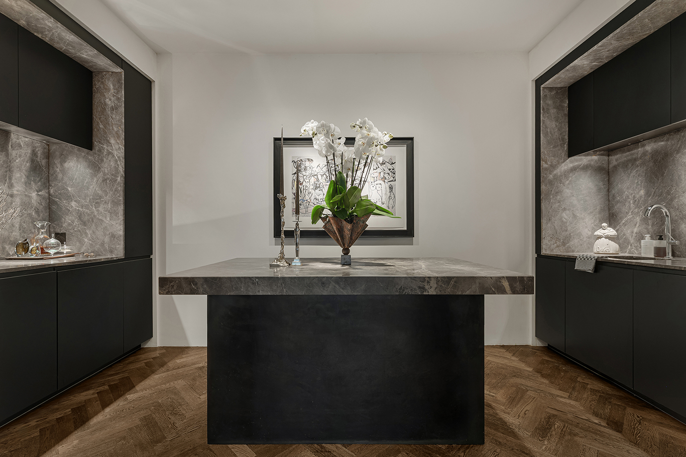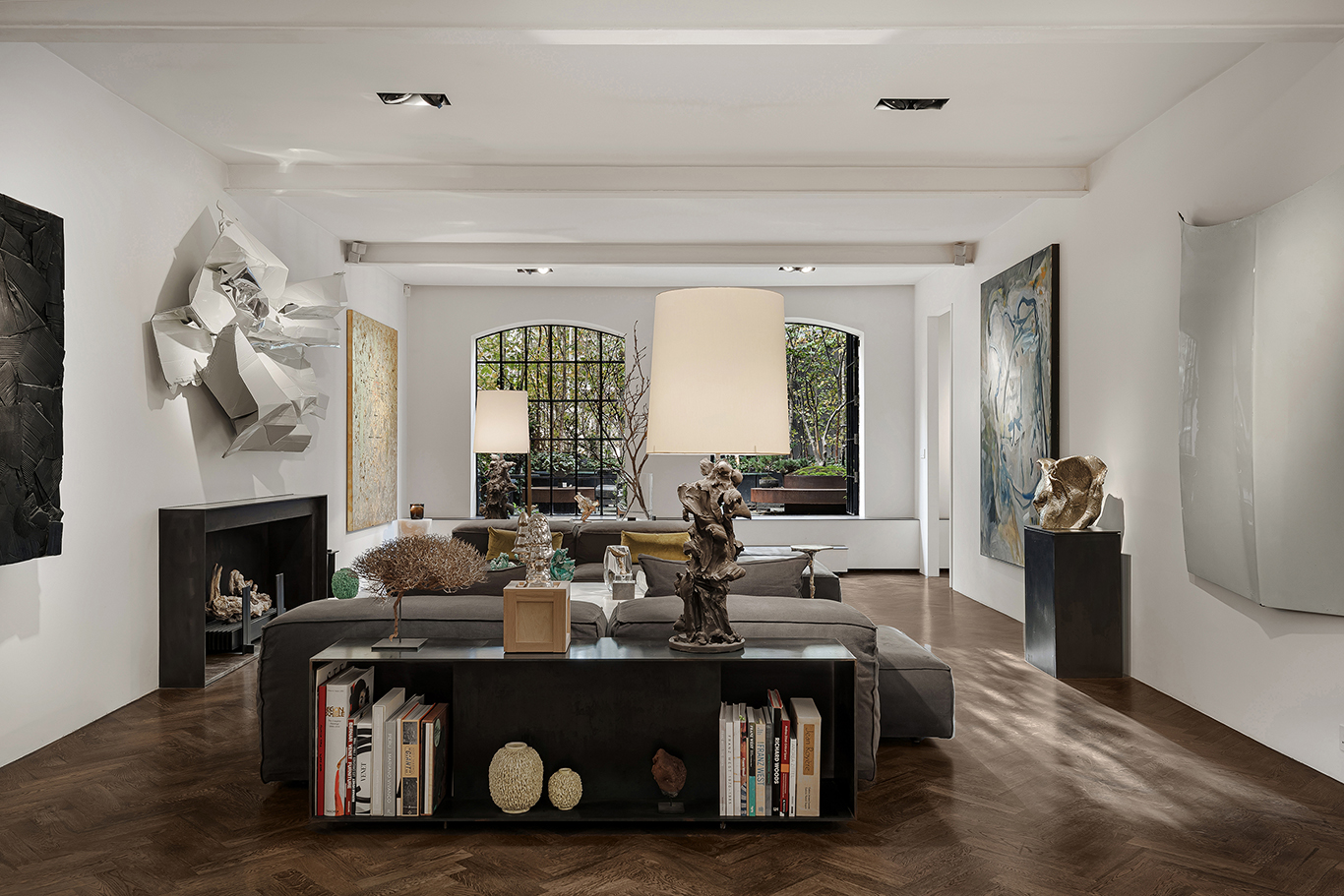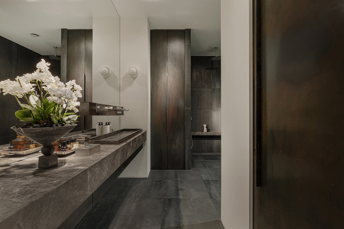 The main floor remains open and flexible, with a former ceramics studio and a sequence of showrooms. The courtyard retreat is designed like a Japanese garden, finished in Italian travertine with calming fountains. Upstairs is a custom kitchen, dining and living space with oak parquet flooring and dusky marble accents. ‘For 14 years our studio in London has been far more than just a place where we work,’ the designers said. ‘It has evolved into one of our greatest and most immersive creations. It is a living, breathing environment that completely dissolves the boundary between our lives and our art… Every smallest detail of the building has been deeply considered — exquisite materials, timeless and elegant contrasts of noble materials together with metals and stones, often patinated and burnished by our own hands.’