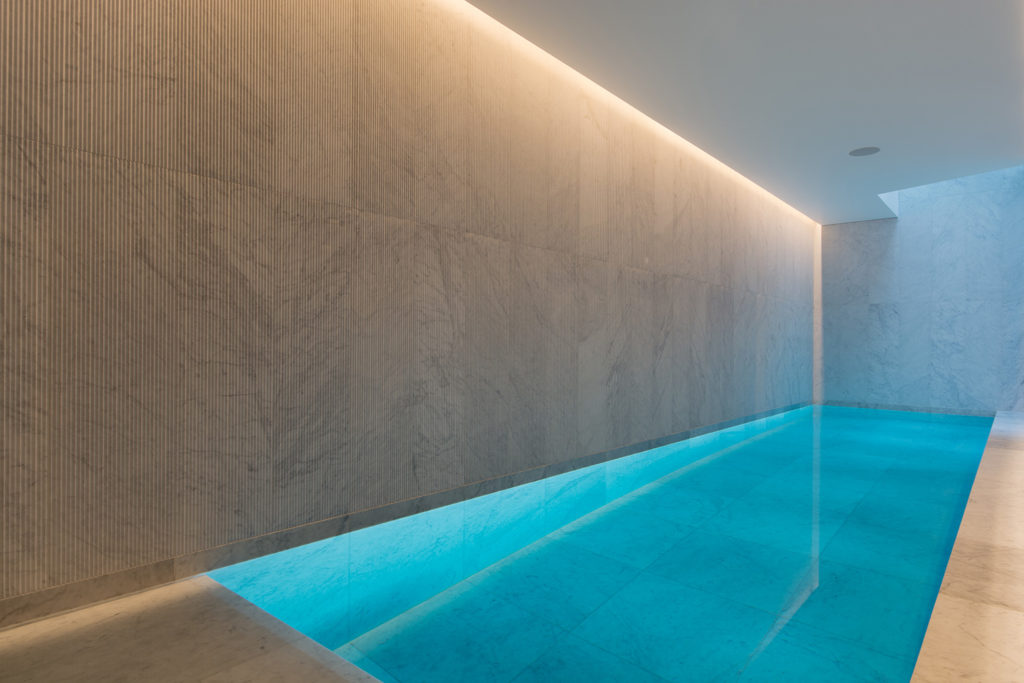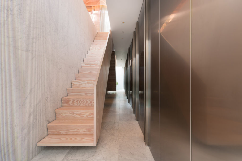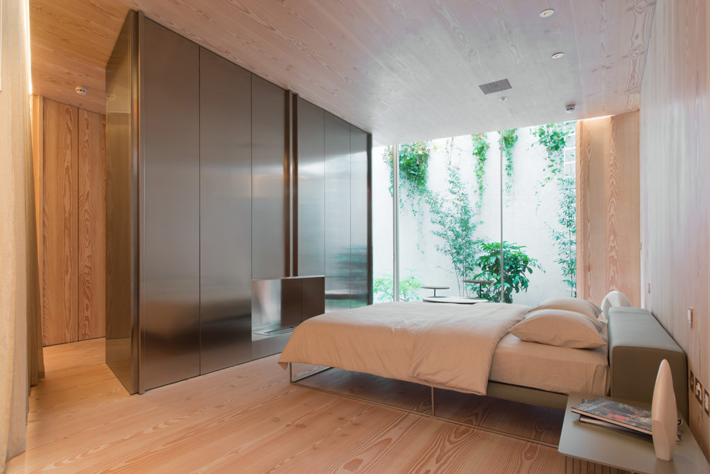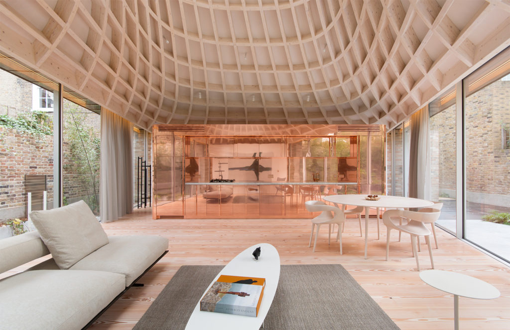 Built in the place of a 1960s bungalow, the two-bedroom Notting Hill home is more than meets the eye with cavernous subterranean volumes. A spiralling spruce ceiling gives the home a cocoon-like feel while exposed timber and glass lends interiors a modernist bent.