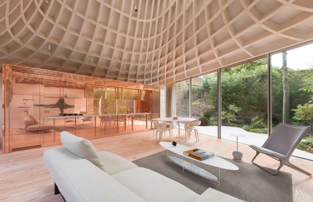 The pitched structure is clad in copper shingles which will age over time, bedding the London property into its Japanese zen garden surrounds.