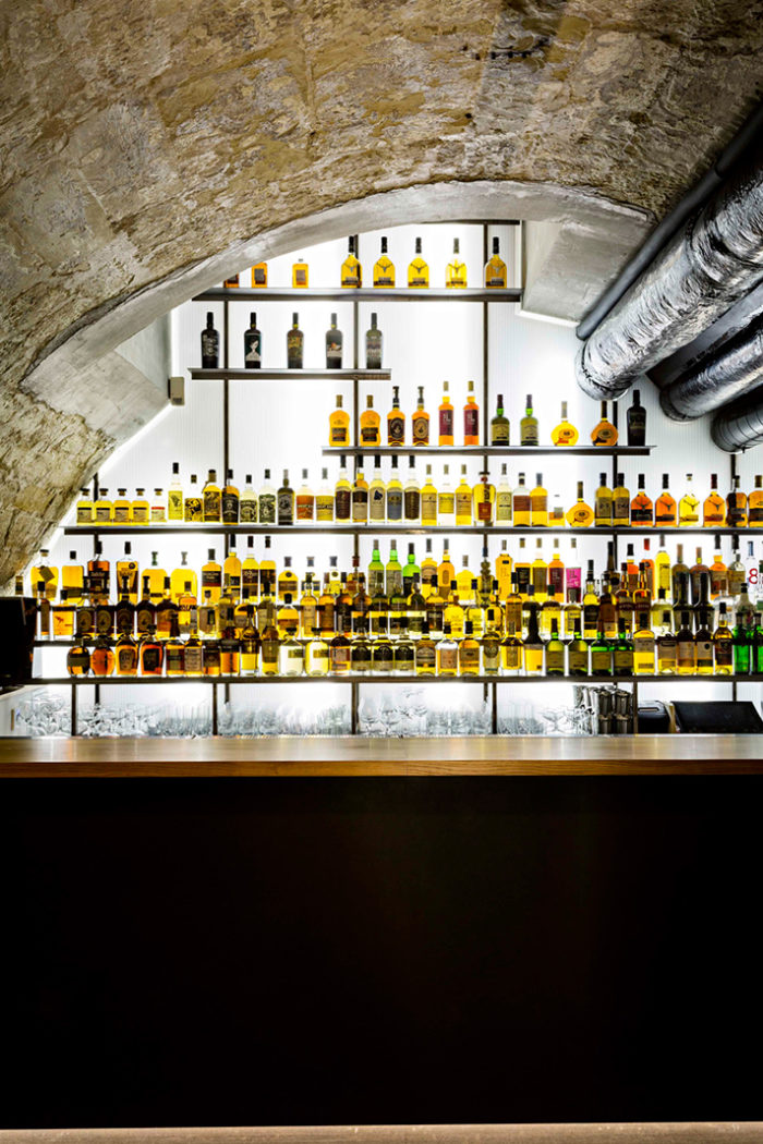 Local practice JBMN Architectes were charged with crafting the interiors of the underground whisky joint, split into three distinctive areas. A speakeasy style space serves 200 types of whisky from a back-lit bar, while a private tasting room dubbed ‘the lounge’ allows guests to sample 800 rare whiskies around a long wooden table.