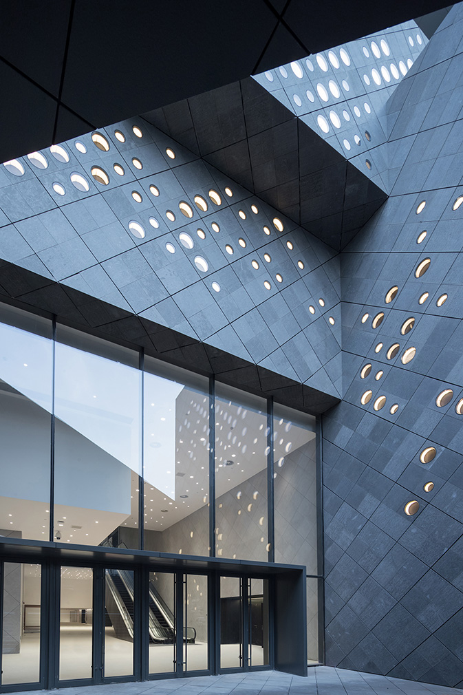 The building’s historically sensitive context prompted a design that references Beijing’s past and present through the distinctly different forms and materiality of its upper and lower portions. A pixelated basalt-stone base evokes the tightly packed nearby traditional hutong courtyard houses, while a crown wrapped in glass panes that resemble giant bricks introduces a contrasting contemporary detail.