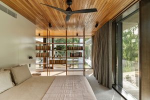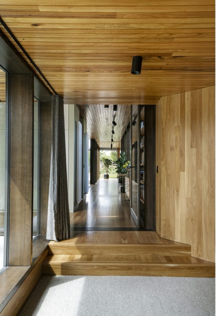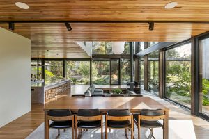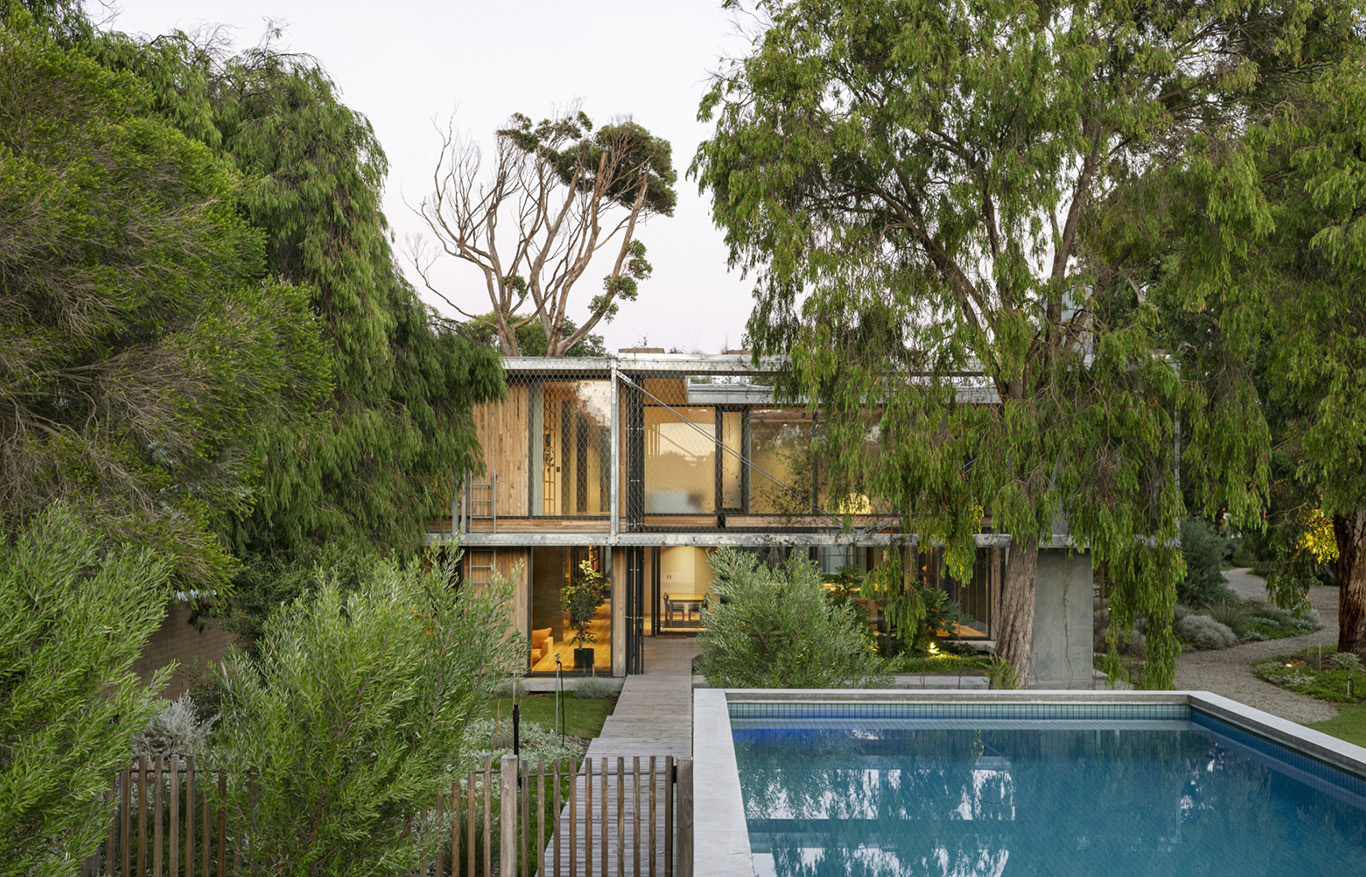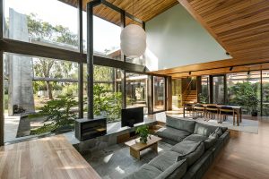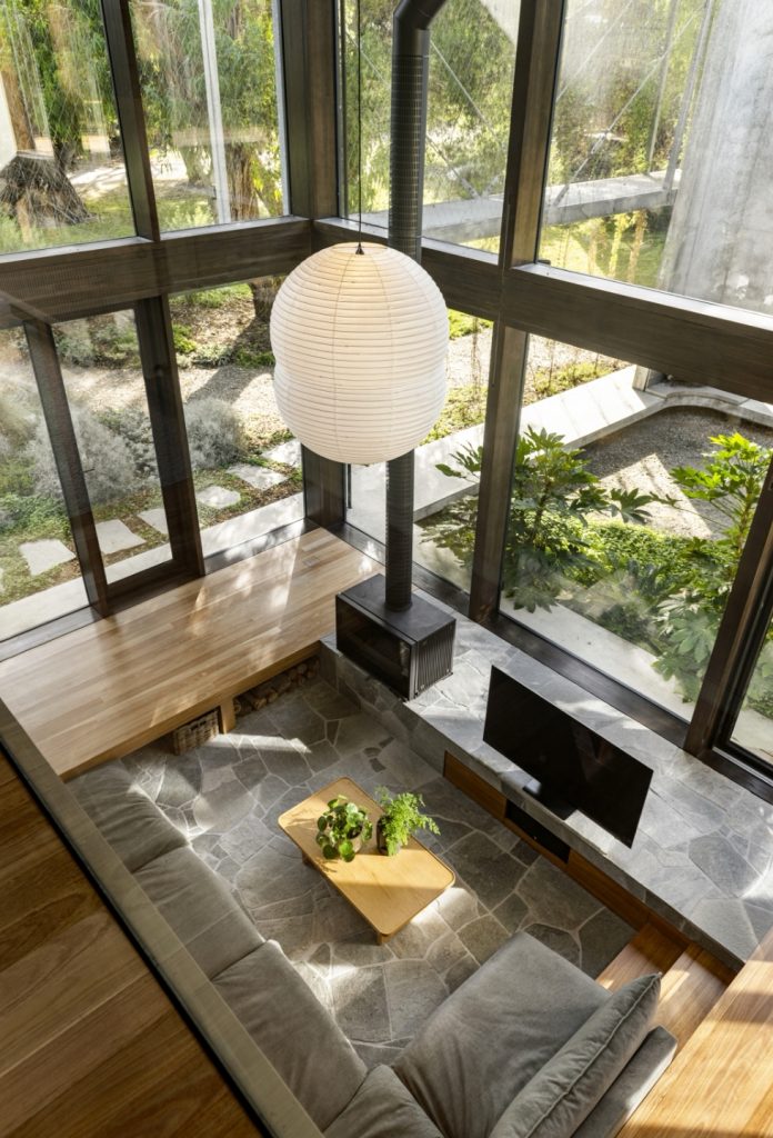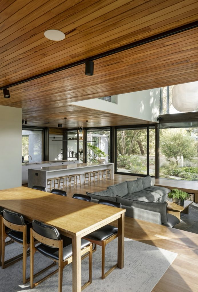The house was designed by Archier around a central concrete core. A galvanised steel walkway wraps around the upstairs, forming an external circulation route that connects the bedrooms and sits among surrounding vegetation. The living spaces are arranged at ground level beneath the elevated structure. Full-height glazing runs along the perimeter, opening the rooms to the landscape and allowing views through the house to the trees. A sunken living area is positioned around a fireplace, with timber linings, concrete and stone used throughout.