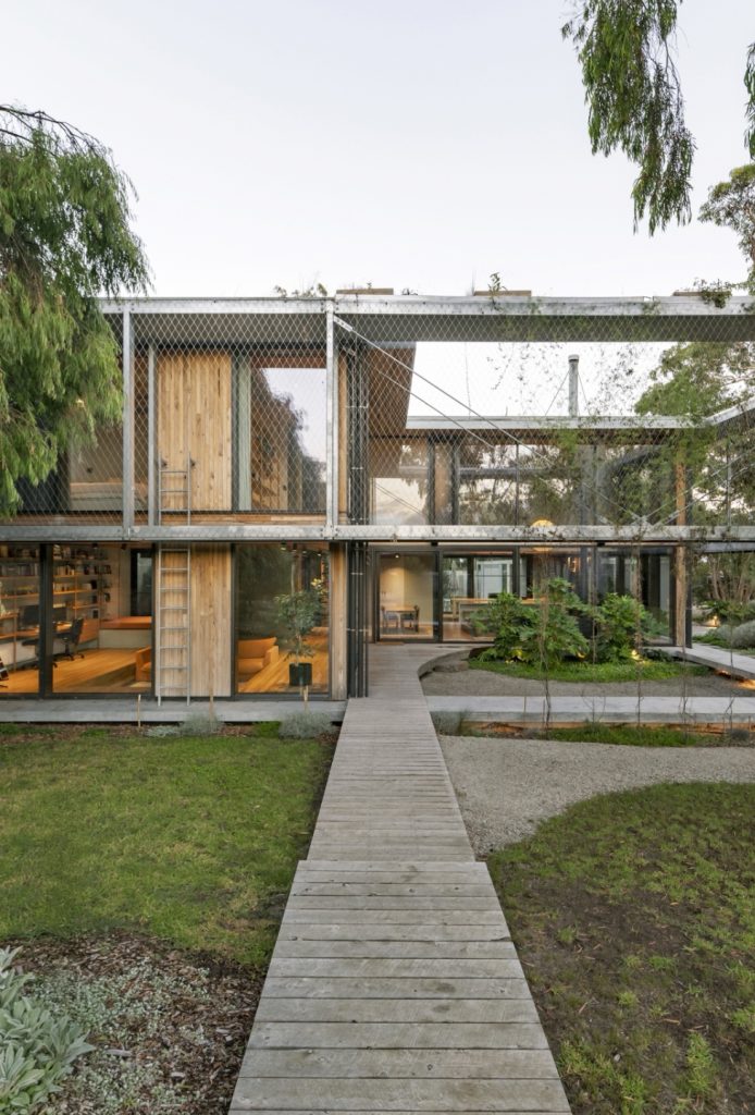 There aren’t many properties like this coastal house in coastal Inverloch, southeast of Melbourne, with an upper level in the tree canopy, enveloped in silvertop ash and wrapped by a steel walkway. Called, appropriately, Walkway House, it occupies a 4,932sqm site opposite the dunes. The plot spans two titles, including a primary residence and a separate self-contained dwelling.