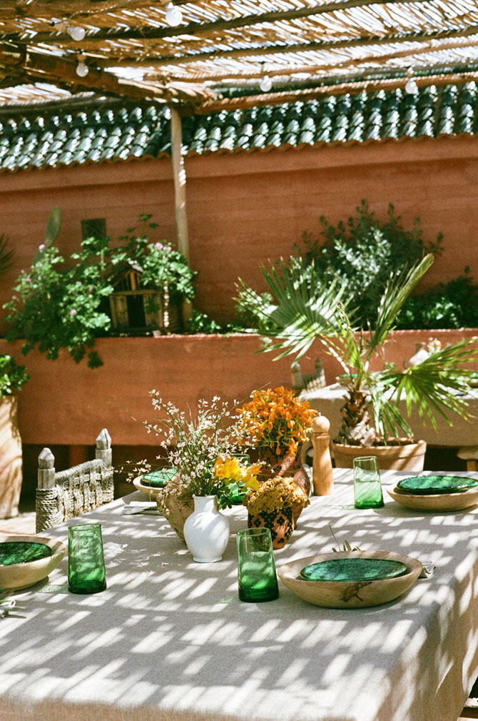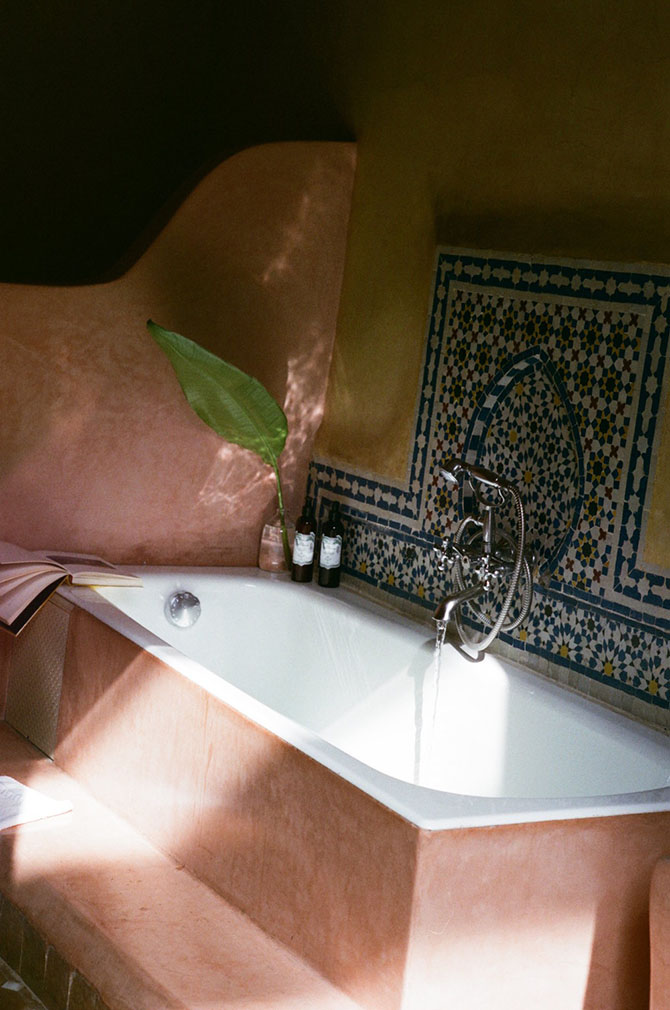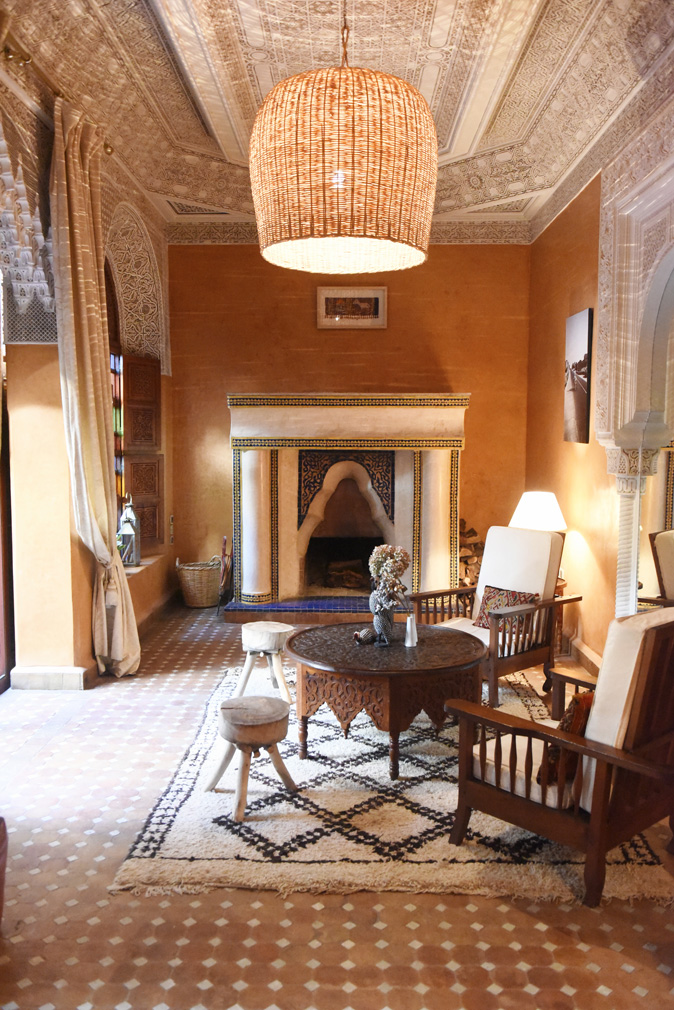 Rooms are all about the details: tall ceilings are hand-painted with ornate patterns and furnished with handmade objects. (A boutique store inside the riad showcases locally-made objects, from carved spoons to kilims and leather goods.) Bathrooms are also decked in Zellige tilework.