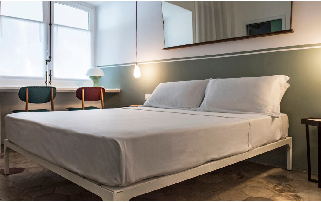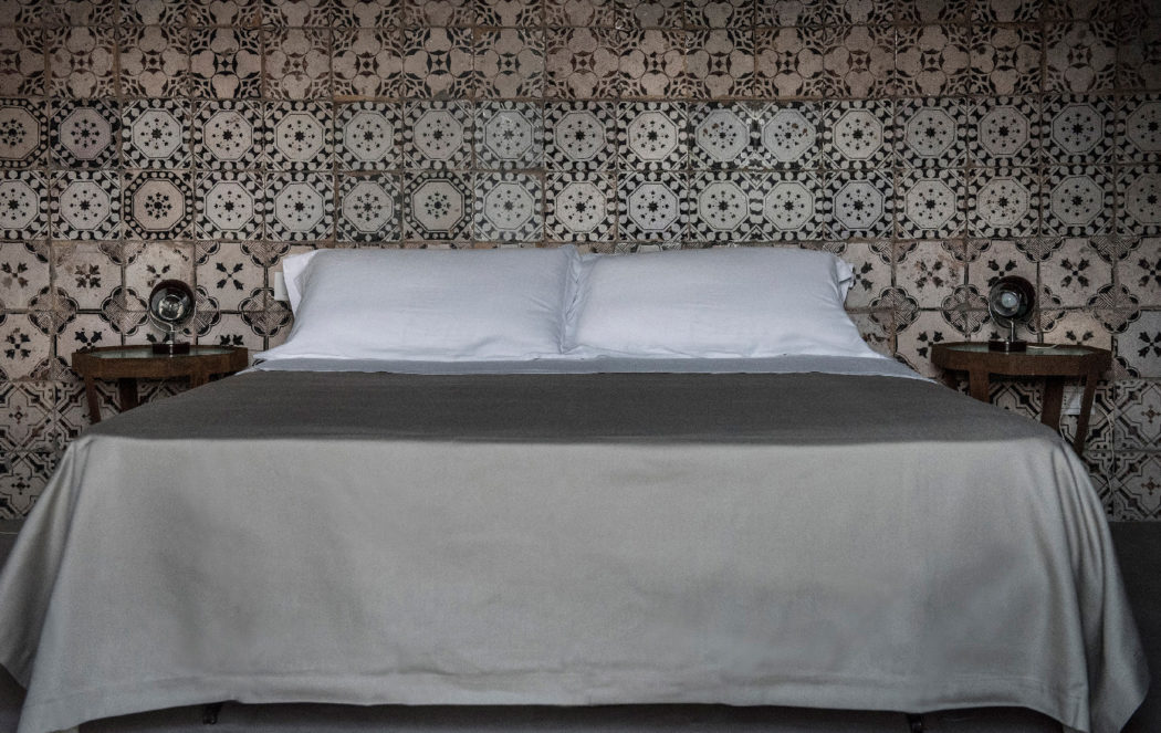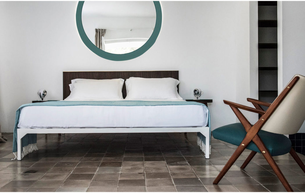 Next up is Olive House, which is the more demure of the duo and hides among the trees, 200 m from the shore. Its tall rooms are capped by whitewashed beams, while walls are decked in reclaimed and ornately decorated Sicilian tiles.