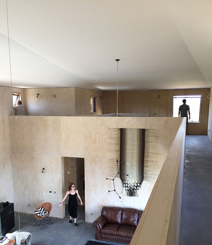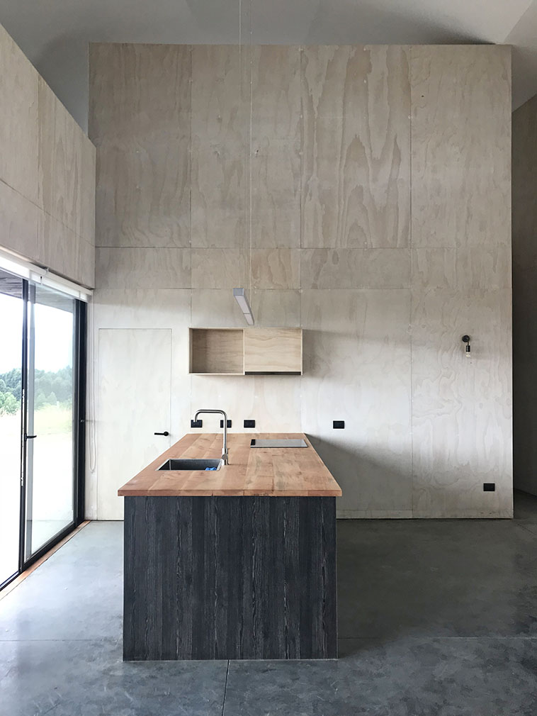 On the ground floor, a double-height kitchen and living room act as the heart of the holiday home – available to rent via Boutique Homes from $500 per night. Cupboards have been discreetly hidden behind plywood walls, maintaining the house’s pared-back, minimalist look.