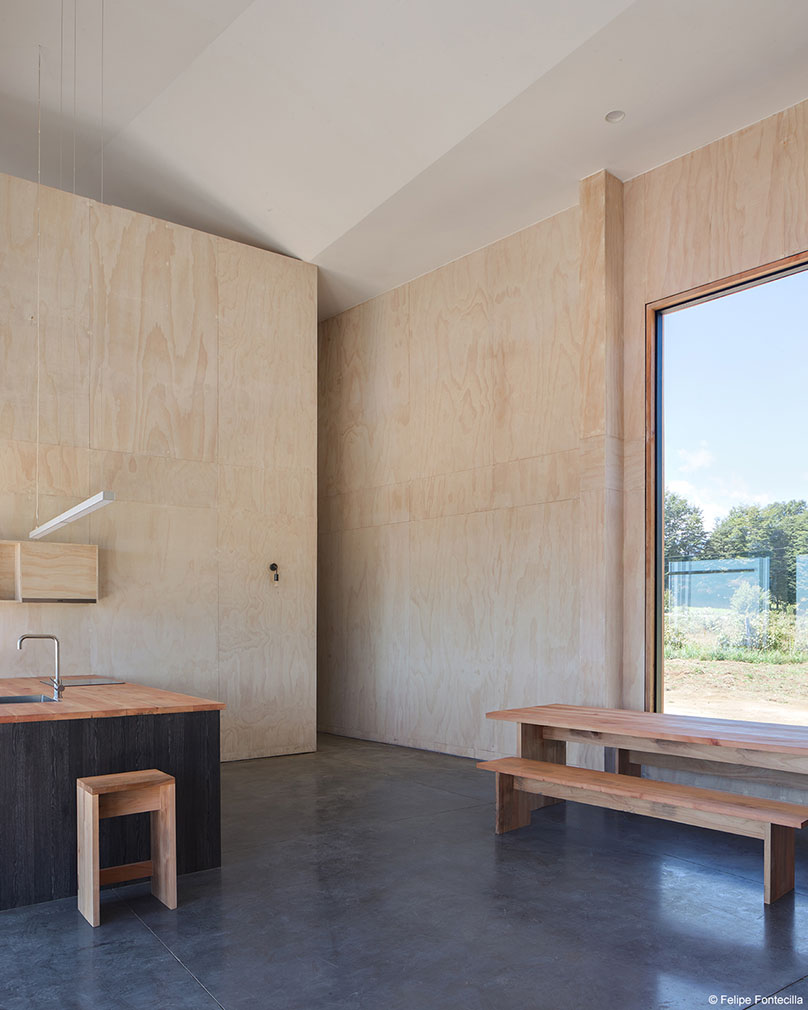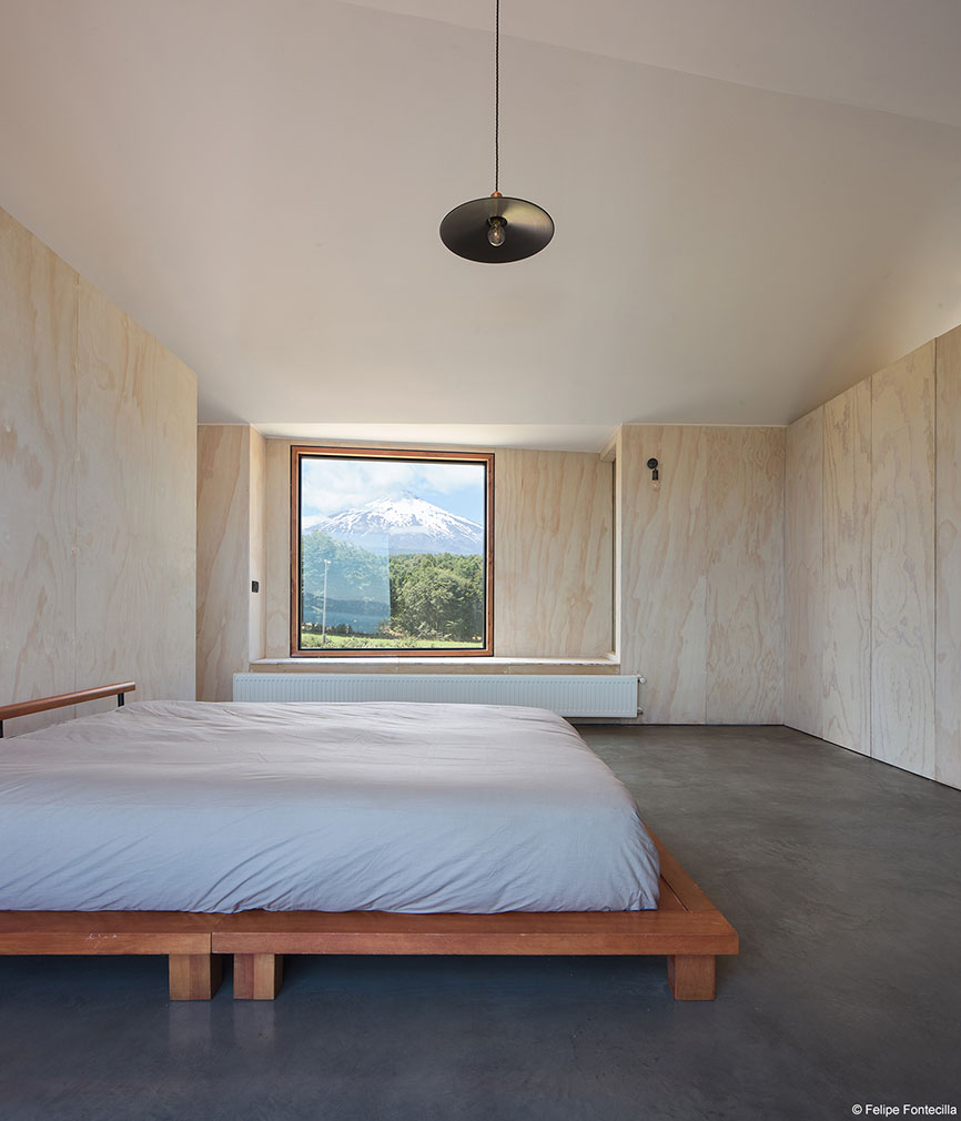 Ampuero Yutronic has deliberately contrasted the interiors of the Chilean holiday home to the blackened exterior, using blonde plywood walls and light concrete floors. Large, rectangular windows of varying sizes across the property frame mountain views and break up the uniformity of the building’s facade.