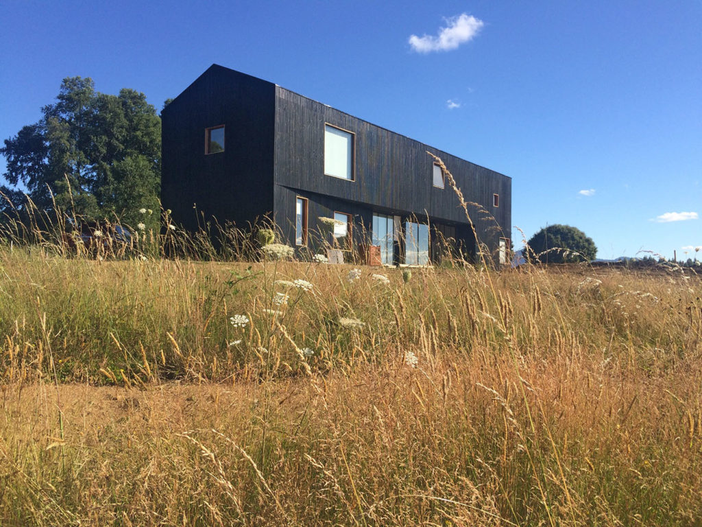 Casa Hualle riffs on its dramatic setting in the Araucanía Region. Its dark timber facade nods to the volcanic stone native to the region and traditionally used to build houses, while its imposing rectangular volume has a steep angular roof at one end, inspired by the pitched roof sheds that dot the area.