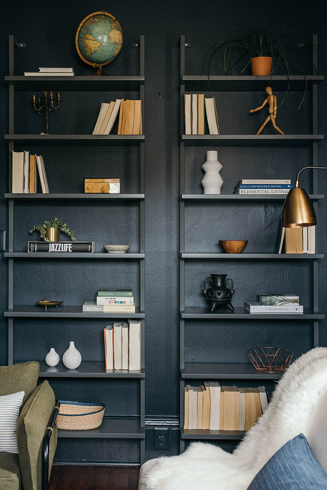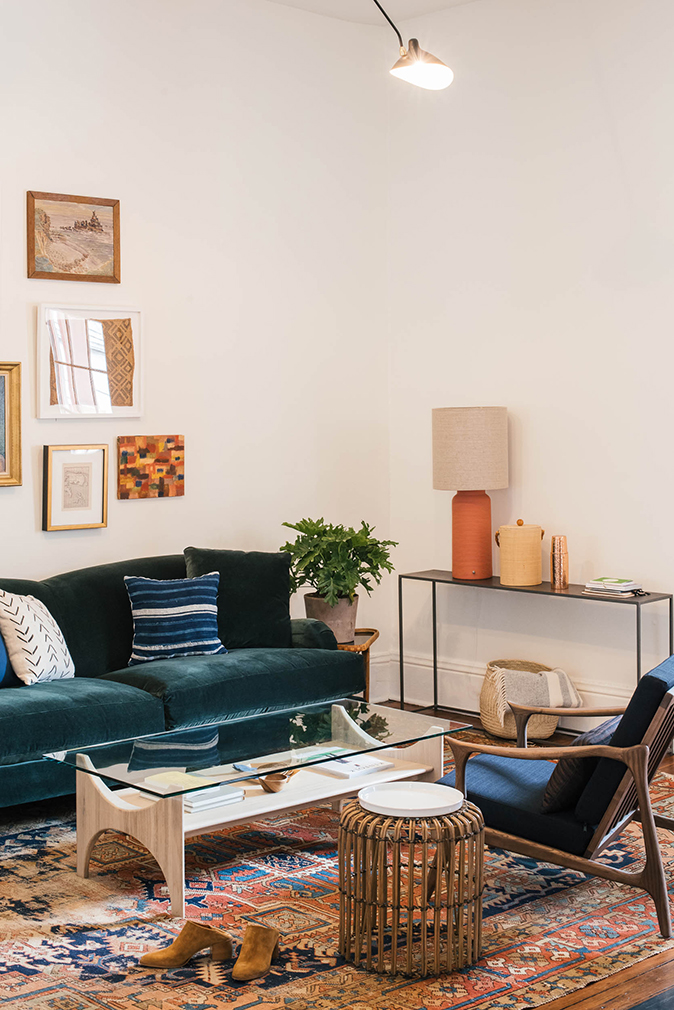 Much of the furniture was sourced locally, including chairs salvaged from a nearby jazz bar, while the sofa is upholstered in velvet to add a sumptuous twist to the moody living room space.