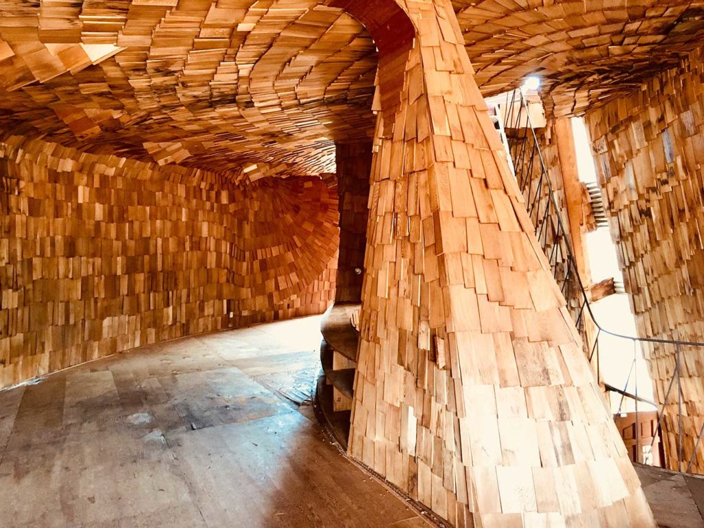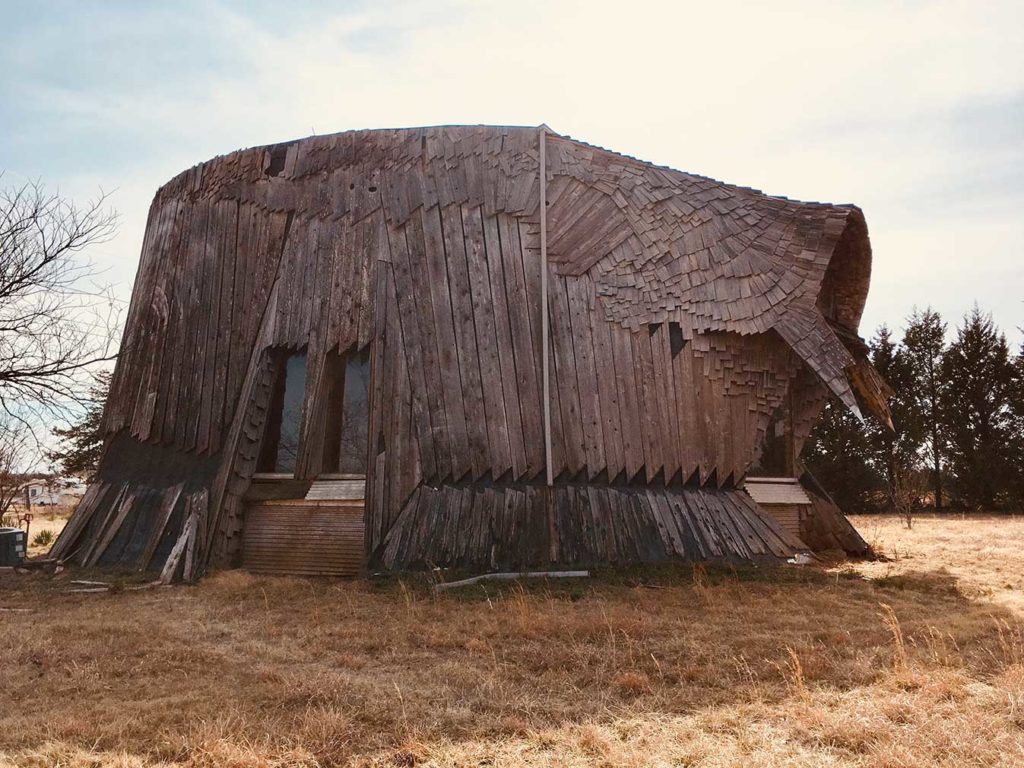 Bulky, low-lying, and covered in overlapping cedar boards evocative of scales or feathers, the two-bedroom house has an animal-like form. Life magazine dubbed it the Prairie Chicken House while others have described it as a ‘shaggy buffalo’ and a ‘weird, dishevelled bird’. Its slightly warped shape gives it the appearance of a centuries-old, weather-beaten prairie dwelling.