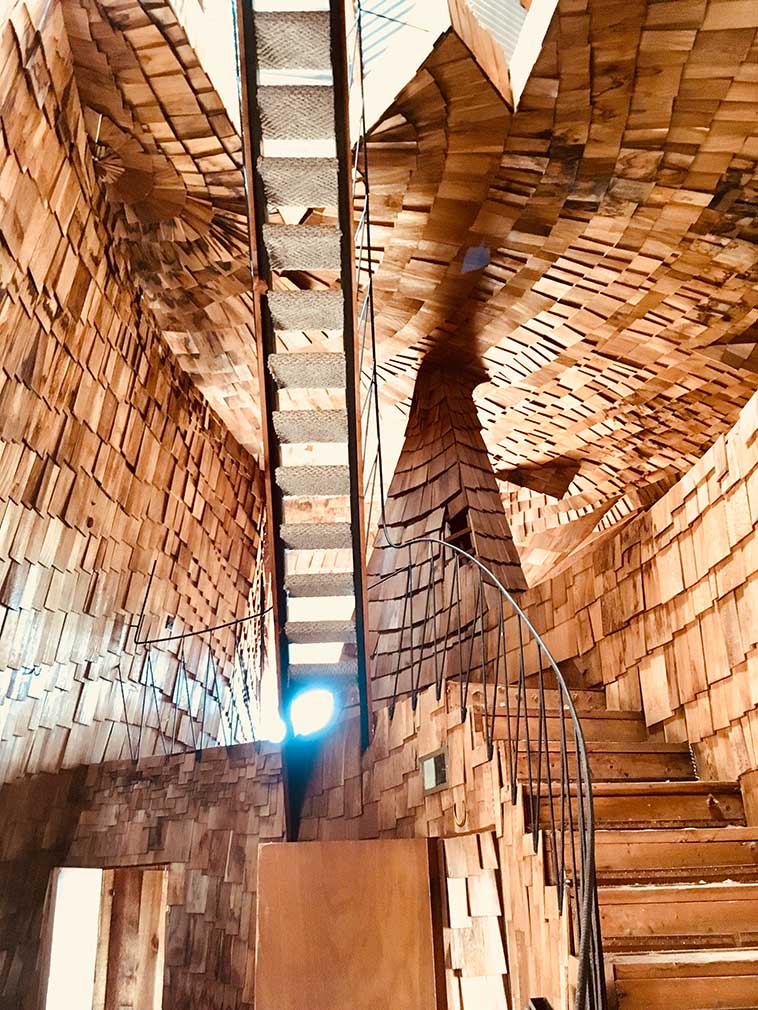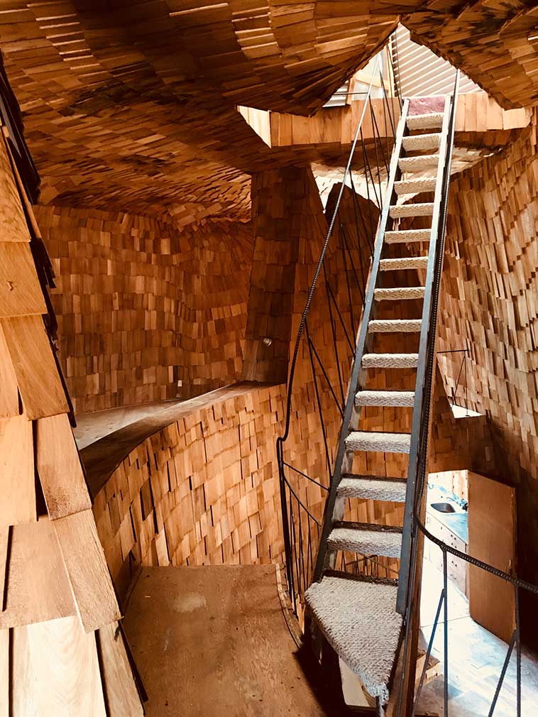 Set over three floors, Prairie House’s abstract, open interior is clad in cedar shingles, which glow amber in artificial and natural light. A thin metal ladder on the first floor leads up to a jagged hatch in the floor of the top-floor living space, which brings light down through the centre of the house.