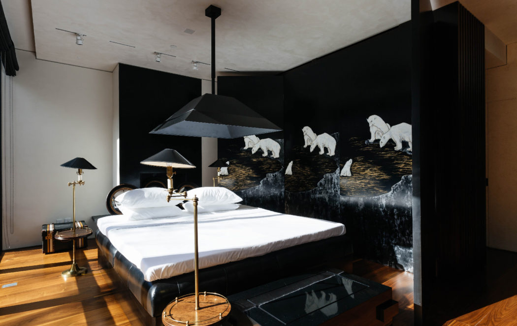 Dark walls jibe with floor-to-ceiling glass, mirrors, low-slung velvet sofas and brass accented furniture. Meanwhile, a huge fireplace dominates the sitting room, adding a sense of cosiness to the sitting room and a smattering of Asian artworks and objets d’art nod to the owner’s heritage.