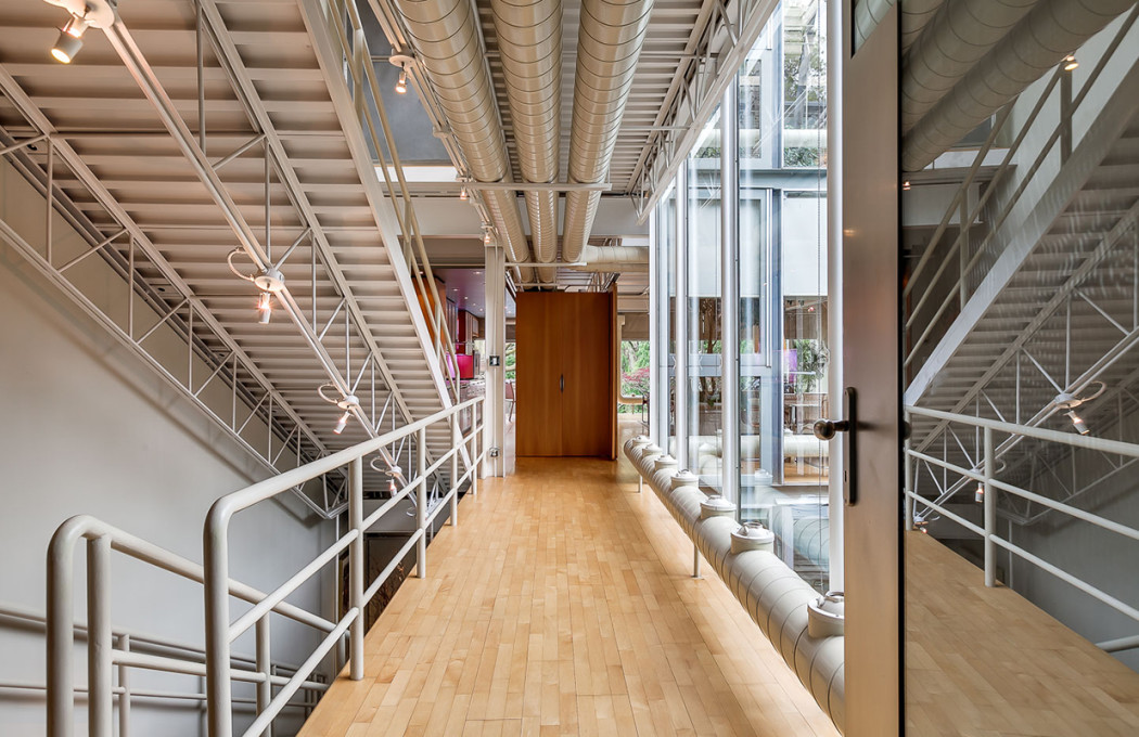 American architect Barton Myers – still at an early stage of his career when he designed the home in 1974 – gave industrial materials a new elegance and refinement. The structure’s steel skeleton is its key feature and exposed ducts run throughout the house. Built-in wooden furniture provides a softer counterpoint in internal spaces that are enclosed by floor-to-ceiling windows.