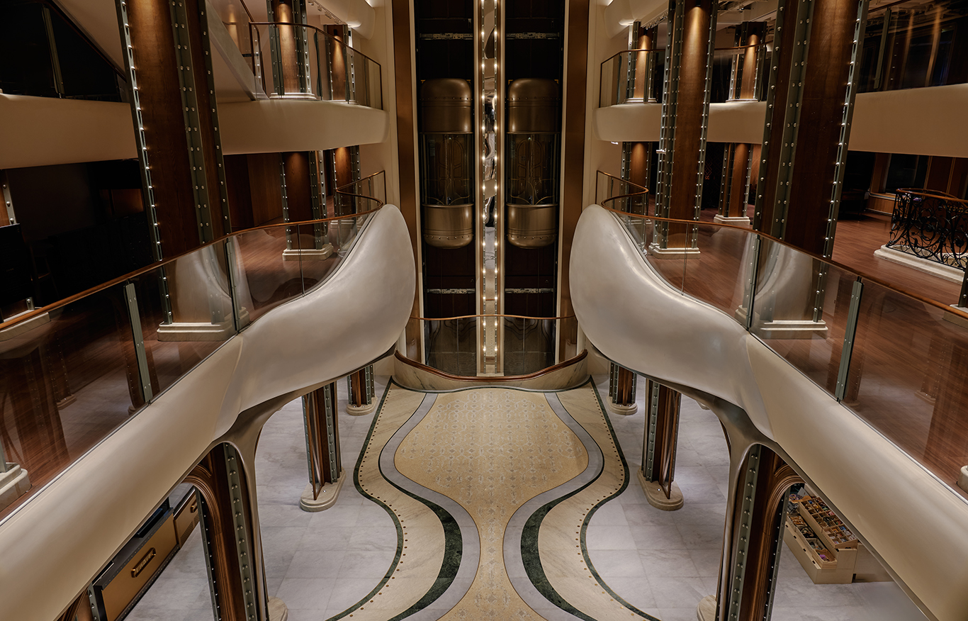 At the ship’s heart is an escalator with a monumental bronze flower stem rising on either side — less a means of circulation than a narrative device. ‘The ship shifts dramatically from level to level, and we wanted to simulate a sense of metamorphosis,’ says Shao. ‘It becomes a surreal vessel, transporting you from one world to another.’ Its form is deliberately ambiguous, at once skeletal and organic: a rib cage, a boulevard of canopied trees, even a nervous system rendered in motion.