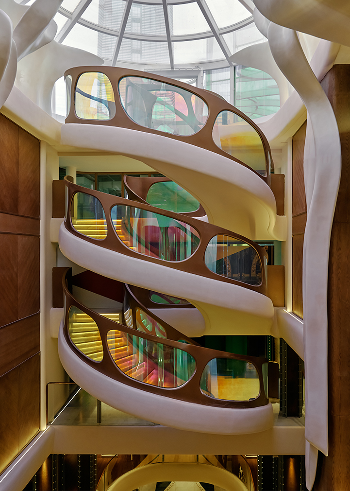 At the ship’s heart is an escalator with a monumental bronze flower stem rising on either side — less a means of circulation than a narrative device. ‘The ship shifts dramatically from level to level, and we wanted to simulate a sense of metamorphosis,’ says Shao. ‘It becomes a surreal vessel, transporting you from one world to another.’ Its form is deliberately ambiguous, at once skeletal and organic: a rib cage, a boulevard of canopied trees, even a nervous system rendered in motion.
