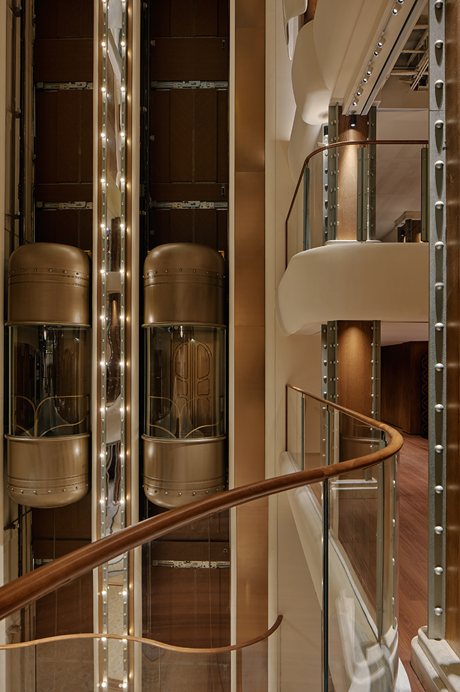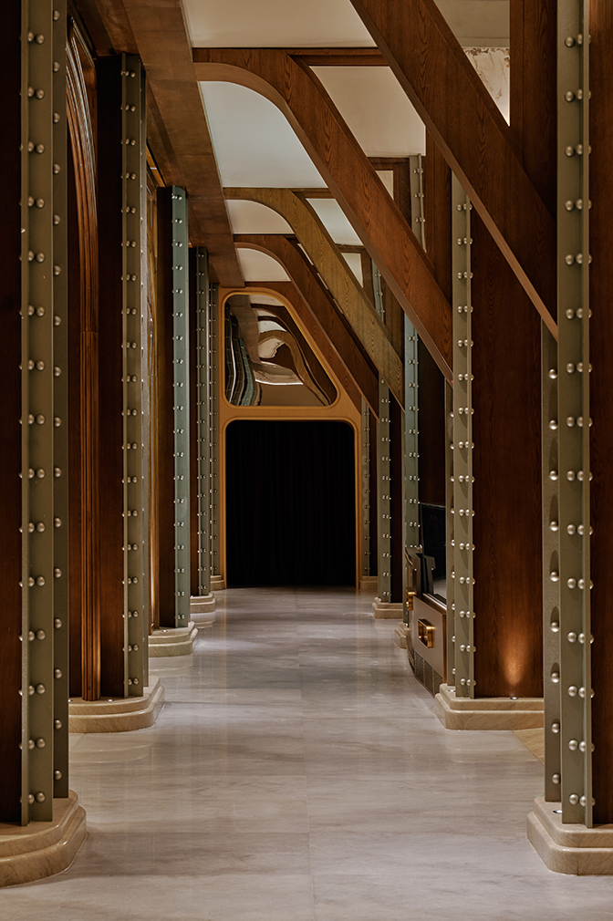 Shao has not erased that layered history but rather re-scripted it elegantly. The liner now houses multiple boutique hotels, waterfront dining, French and regional Chinese restaurants, dessert-only cafes, theatres and music rooms — much like the cruise ship it never was. Design-wise, it borrows some of the most expressive hallmarks of art nouveau, reinterpreted with theatrical flair. The interiors are enhanced with unconventional expressions like silver-studded pillars and sweeping architectural curves. The sculptural lighting is deployed to awe, its repetition creating rhythm, texture and symmetry.