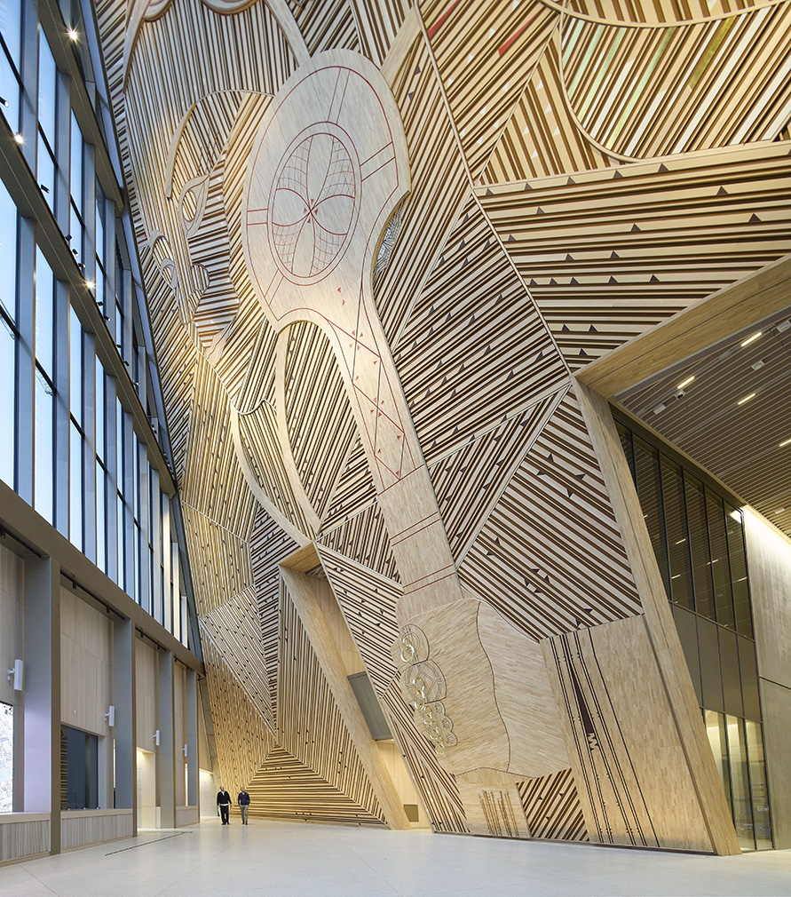 The new faceted glass structure rising from a network of lawns and mosaic pavements is an ethereal beacon in central Oslo. Almost completely transparent, from its tetrahedral roof down through to a skeleton of Nordic birch and stone, it absorbs sunlight by day and glitters with designer lighting by night. Cyclists and pedestrians who cut through the courtyard on their journey through town can stop to admire the 700-square-metre artwork in the pyramidal glass foyer — a timber woodcut mural by the Sámi artist Outi Pieski.