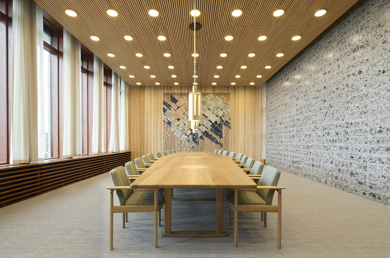 This is Norway’s ‘new face of democracy’, says Stokke, sharply angled to divert arctic winds and allow sunshine into the adjacent park, part of a wider landscaping project by Bjørbekk & Lindheim and SLA. In the wider plan — a high-stakes, high-complexity, high-security scheme — every component is symbolic. Seven buildings hosting some 4,100 people are connected by glass bridges: more transparency. Floors are laid in slabs of local stone or terrazzo aggregated from it. Rooms are furnished in Norwegian oak, with 20% of all pieces reused from defunct government offices. Even the heating is generated from the Oslo fjord.