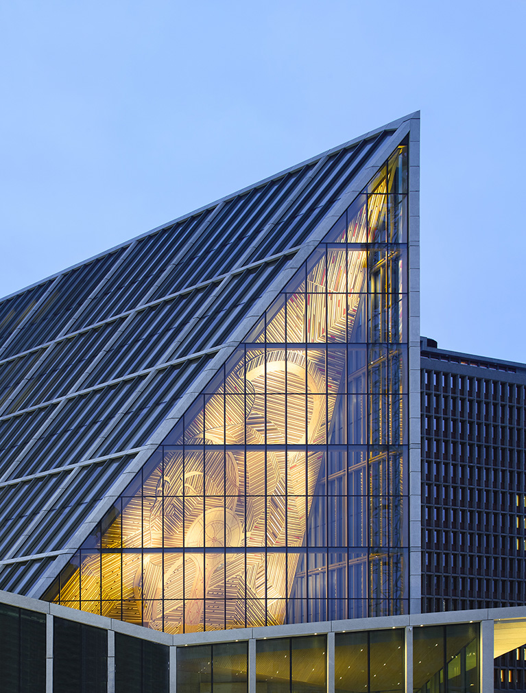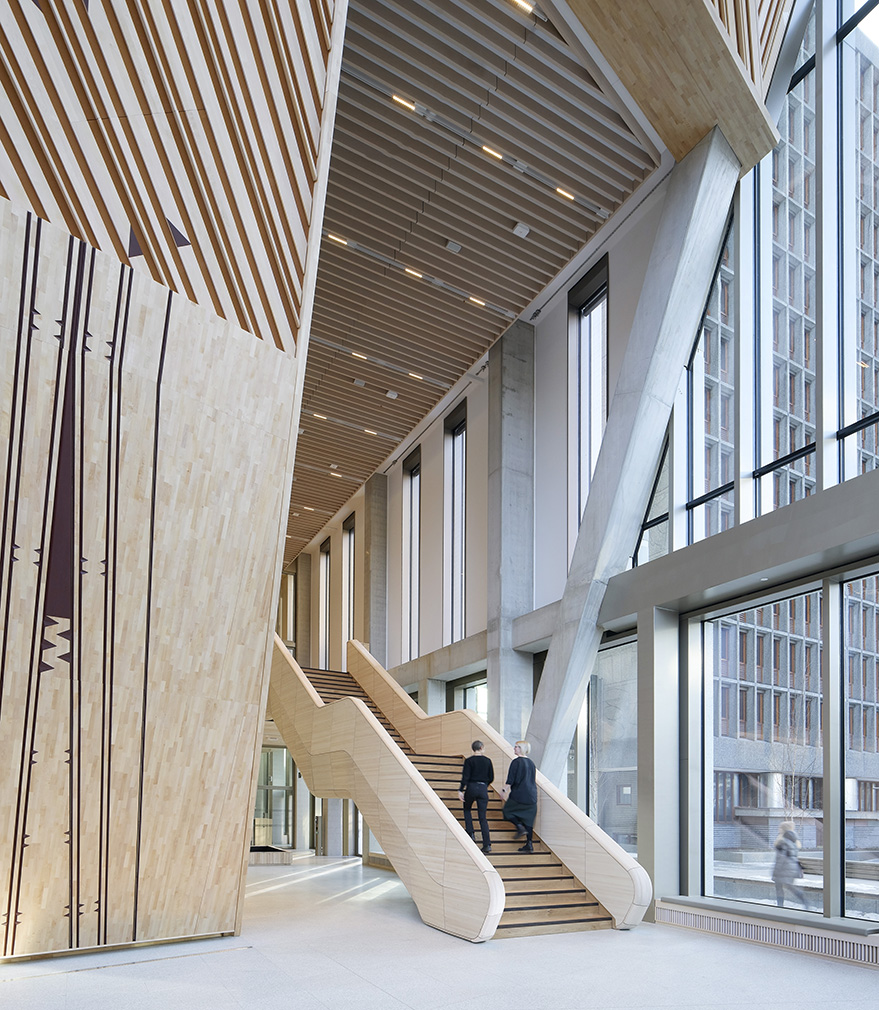 The new faceted glass structure rising from a network of lawns and mosaic pavements is an ethereal beacon in central Oslo. Almost completely transparent, from its tetrahedral roof down through to a skeleton of Nordic birch and stone, it absorbs sunlight by day and glitters with designer lighting by night. Cyclists and pedestrians who cut through the courtyard on their journey through town can stop to admire the 700-square-metre artwork in the pyramidal glass foyer — a timber woodcut mural by the Sámi artist Outi Pieski.