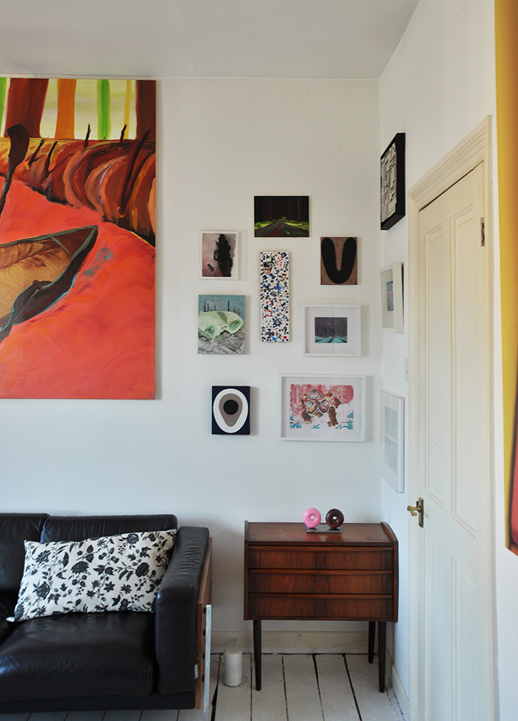 Artworks by (on left, from top): Matthew Draper, Maurice Cockrill, Edwina Ashton. Above the sofa is Matthew Draper’s ‘Carpet Roll’. Photography: Rosella Degori