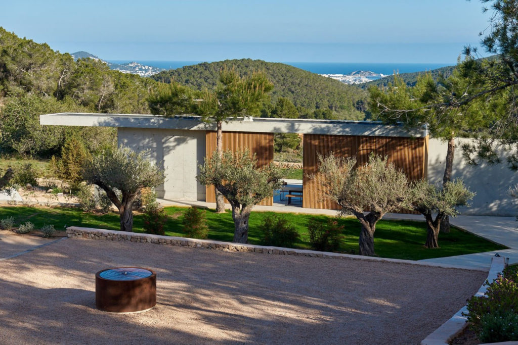 Bedrooms are set snugly at the back of the villa and open onto a wraparound terrace, with views of the property’s stepped gardens from floor-to-ceiling sliding glass doors. There’s also a swimming pool and independent one-bedroom guesthouse in the 14.8-acre grounds, which include forest and orchards, and are part of a natural protected area some 6km outside Ibiza town.